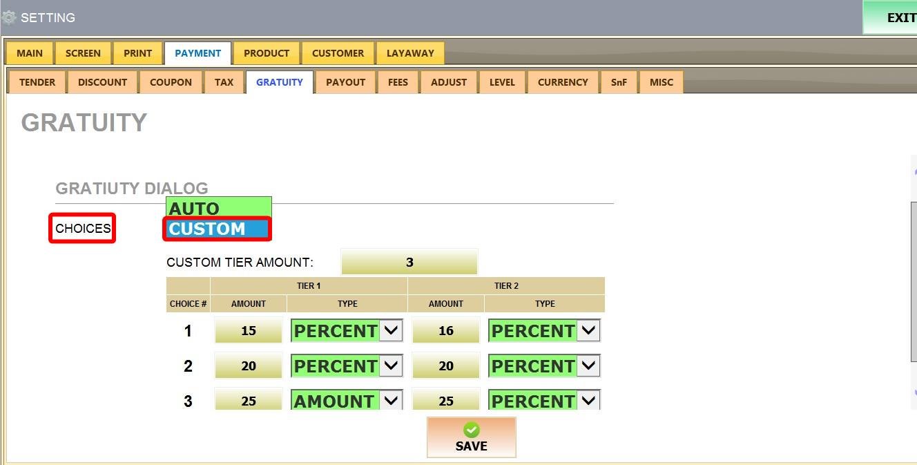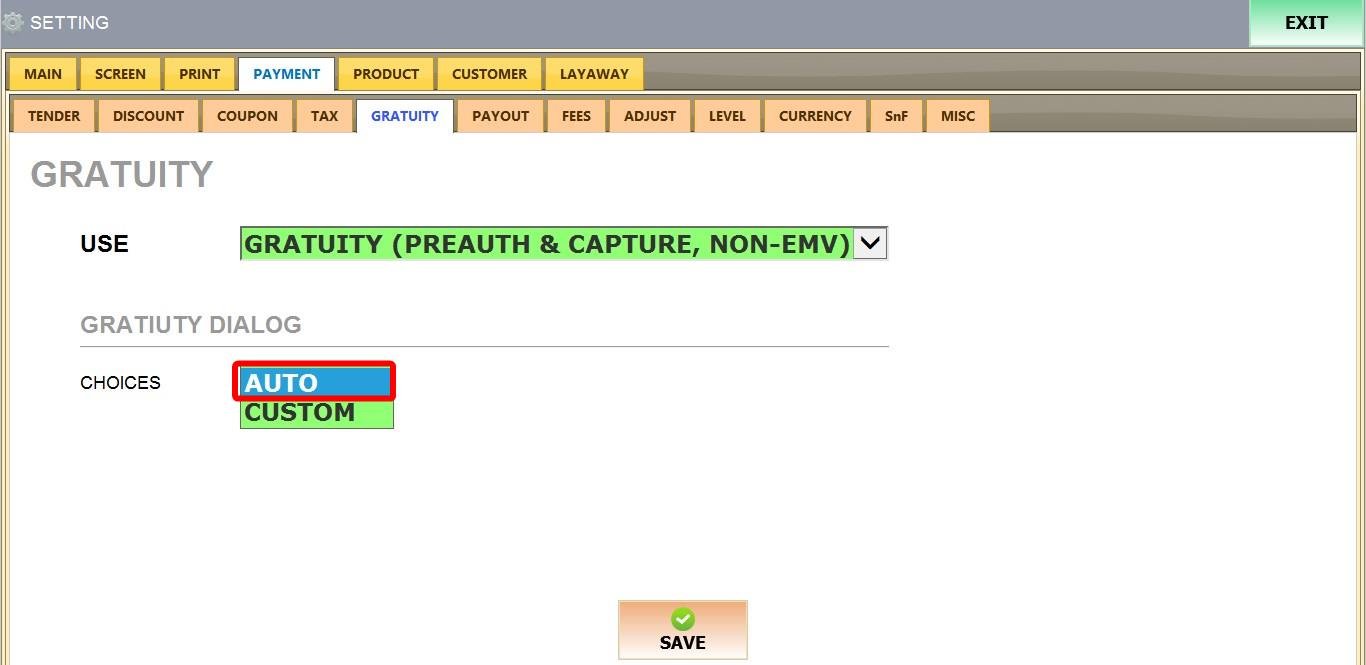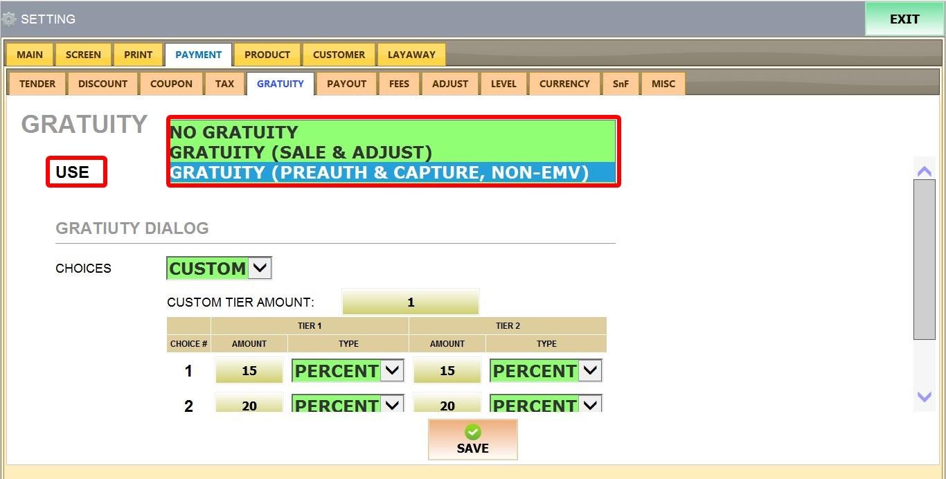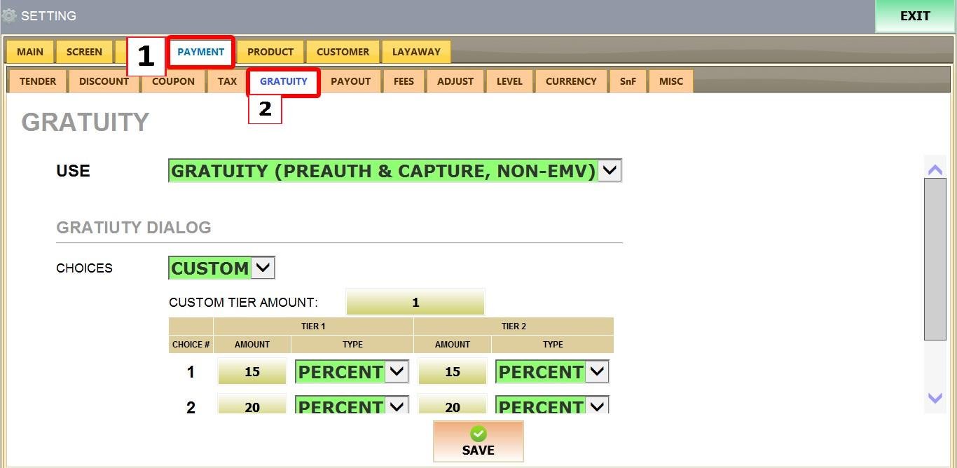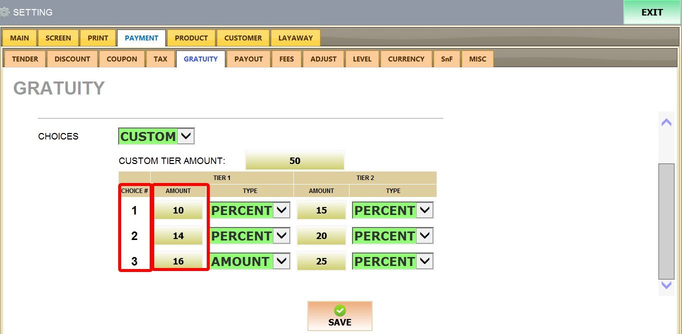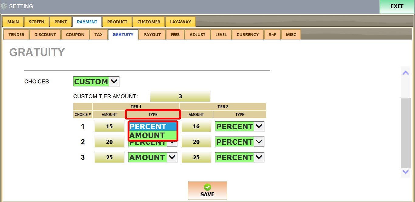 MENU > SETTINGS > PAYMENT > GRATUITY.