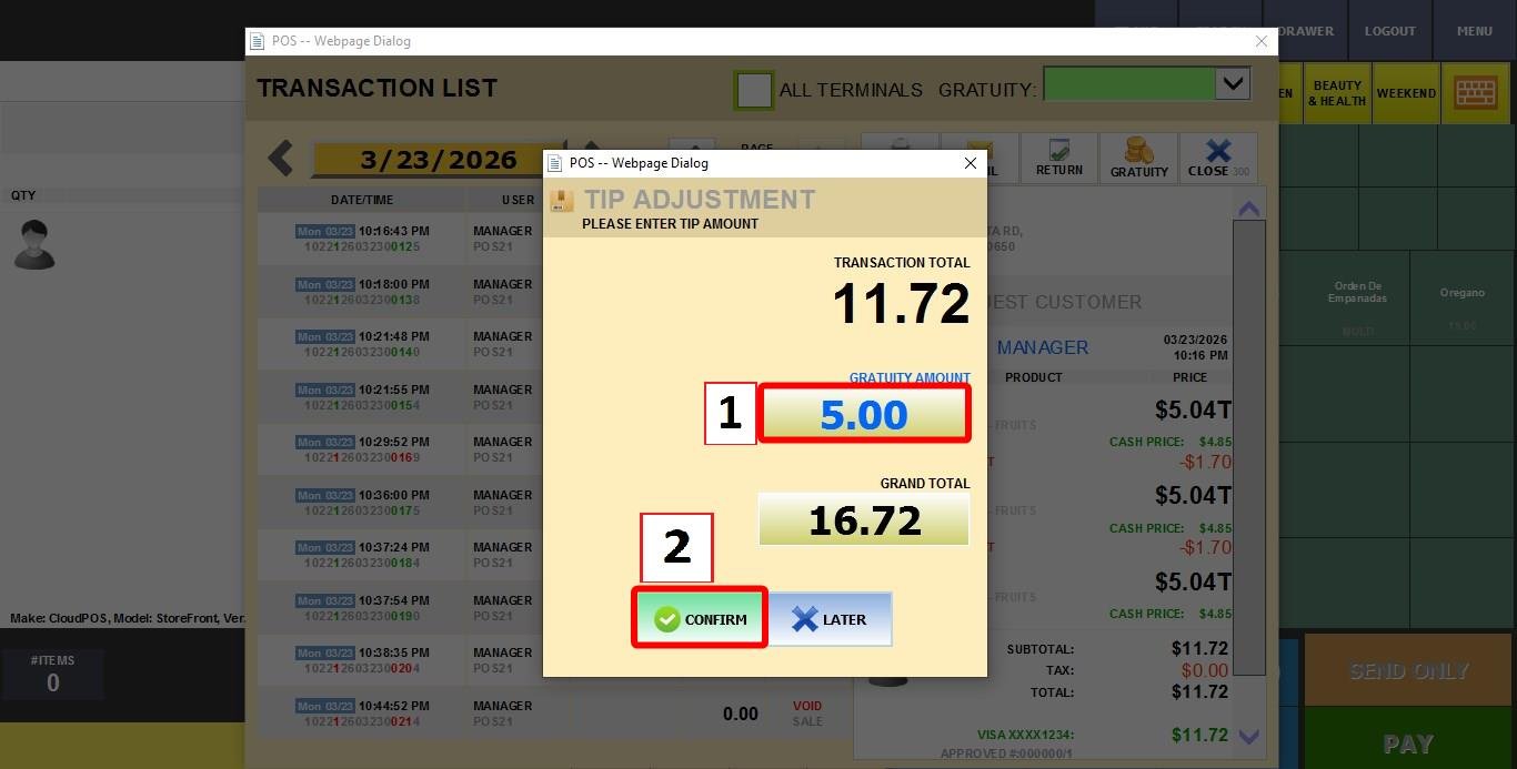2. GRATUITY (Sale and Adjust): Charge the base amount now; add the tip manually later. Commonly used for Fast-paced shops where you handle tips from paper receipts at the end of the shift.