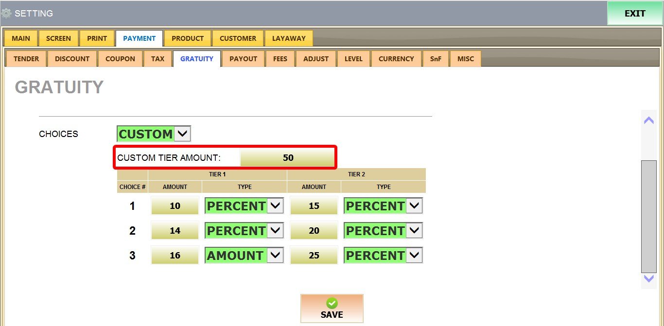 CUSTOM TIER AMOUNT: This is the dollar amount that switches the pinpad screen from Tier 1 to Tier 2.