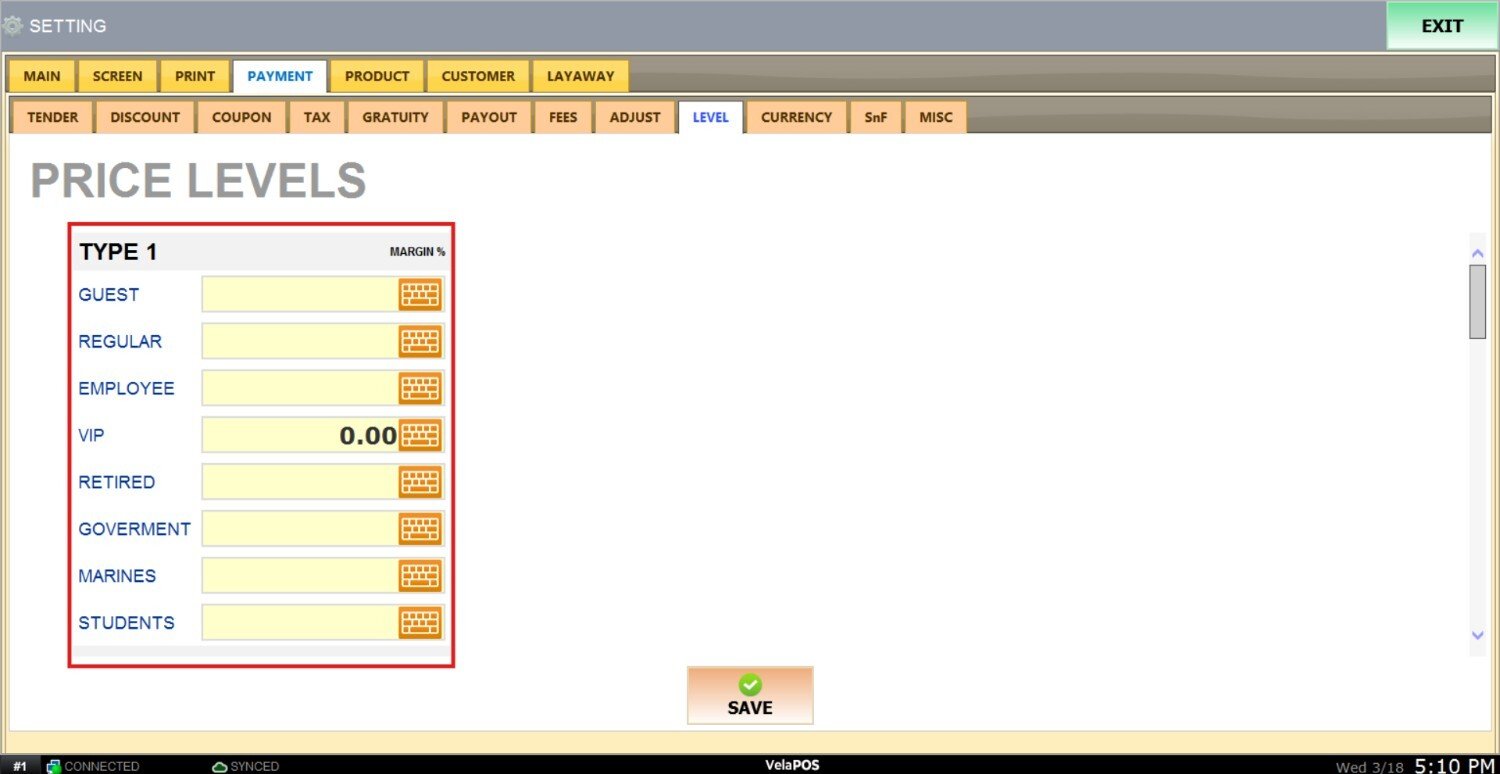 Main Screen> MENU > SETTINGS >PAYMENT > LEVEL.