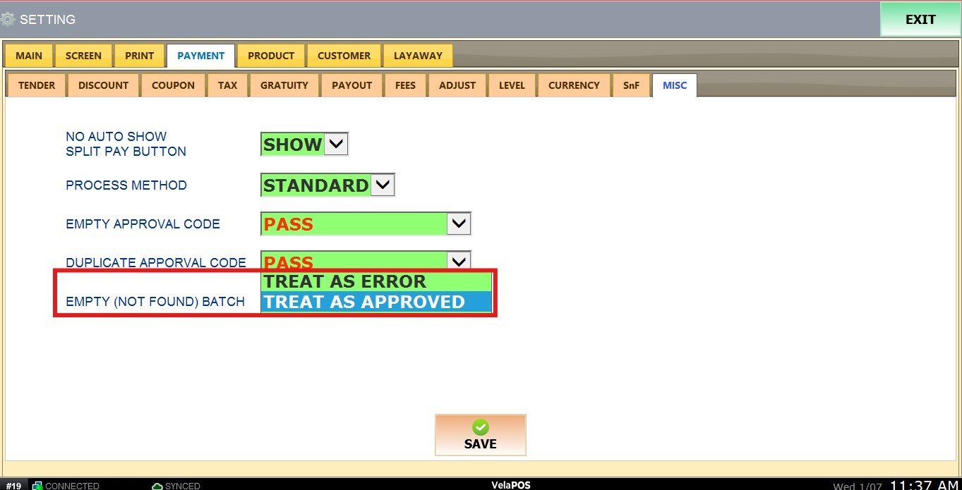 Main Screen>MENU> SETTINGS> PAYMENT> MISC.