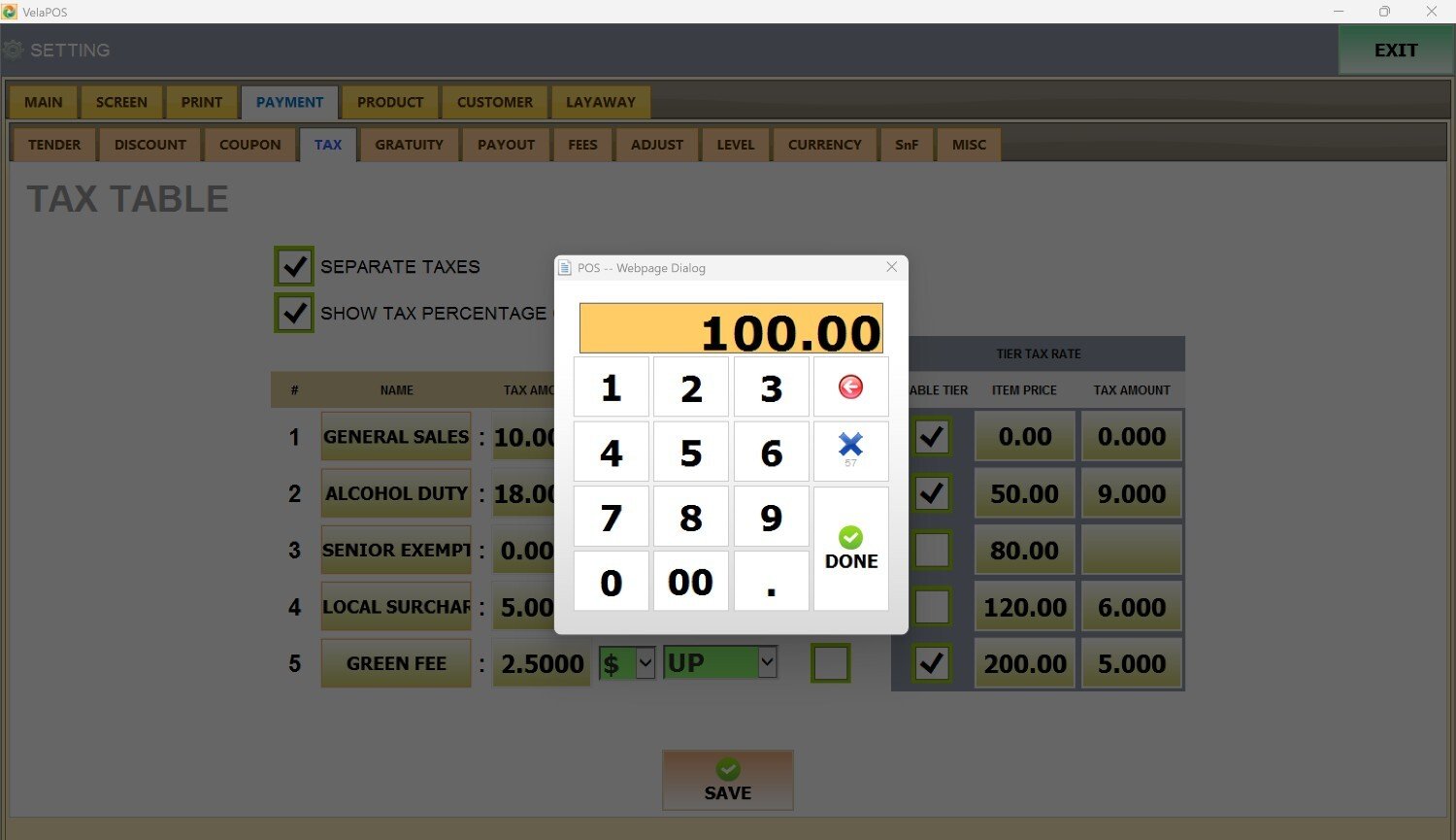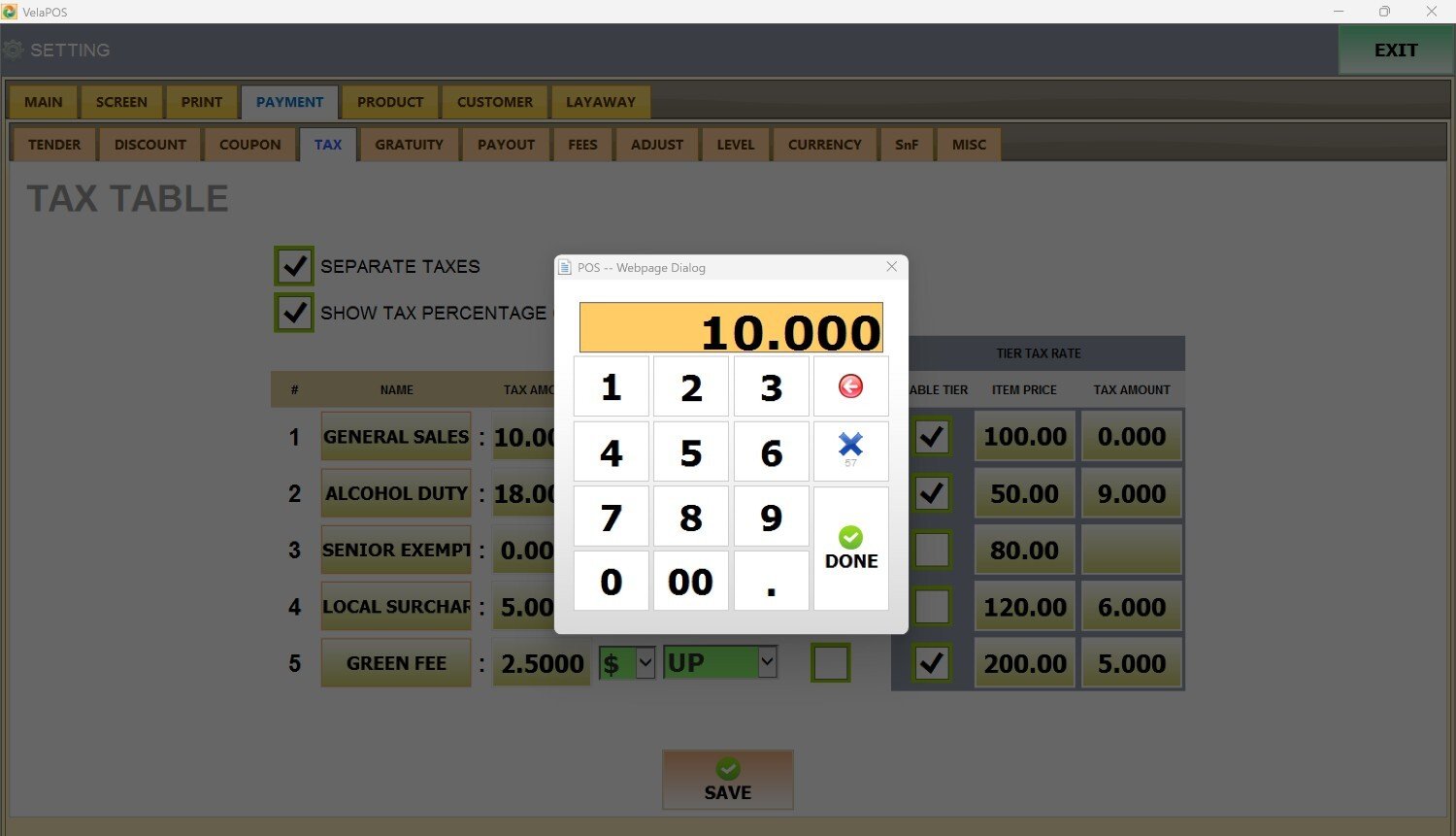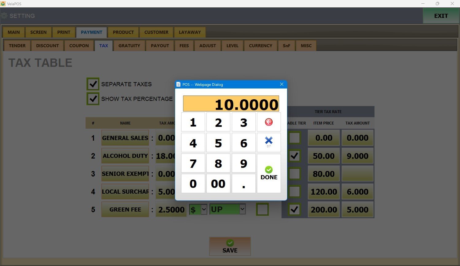 Enter the tax amount for that tier, and press DONE.