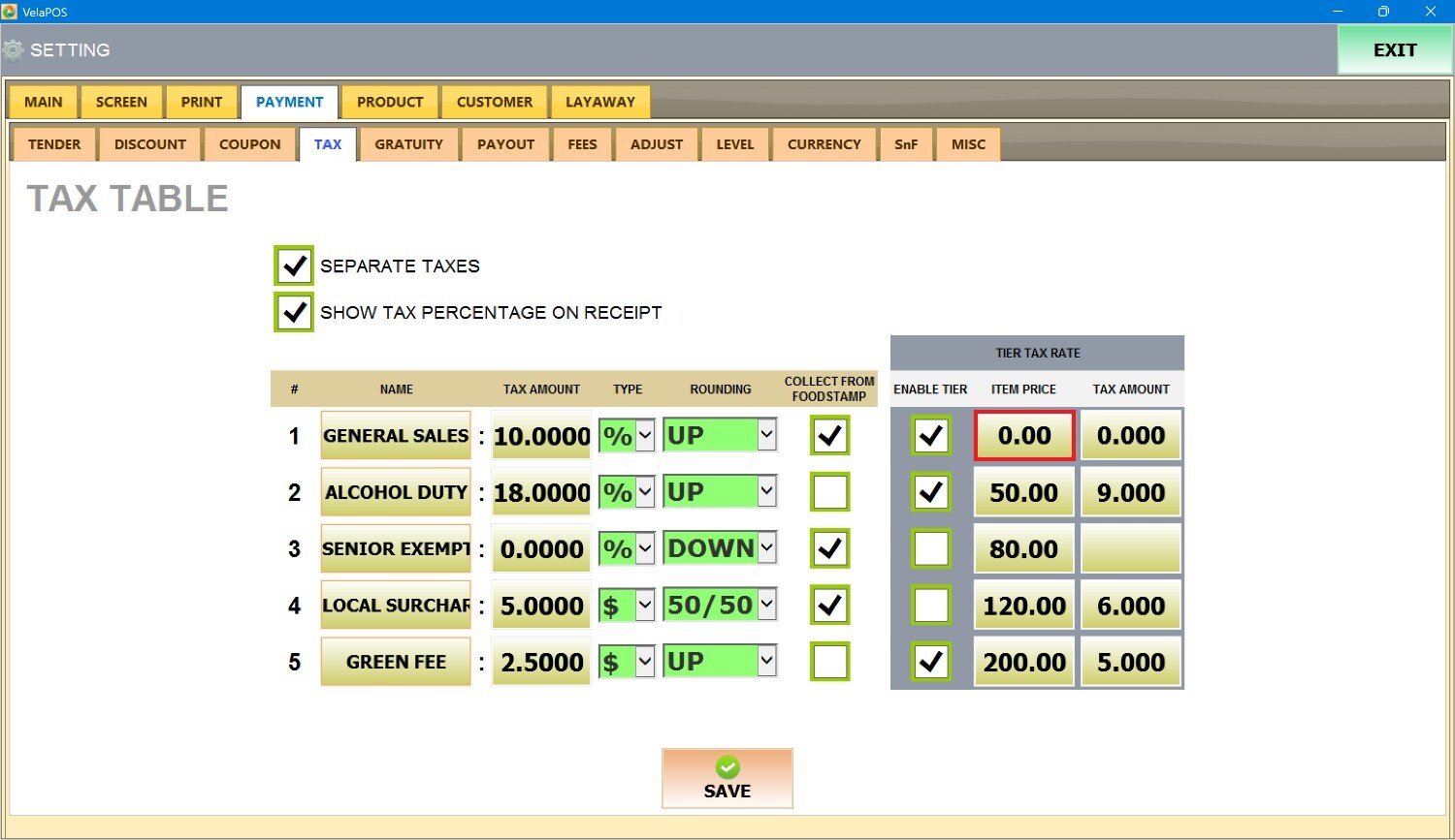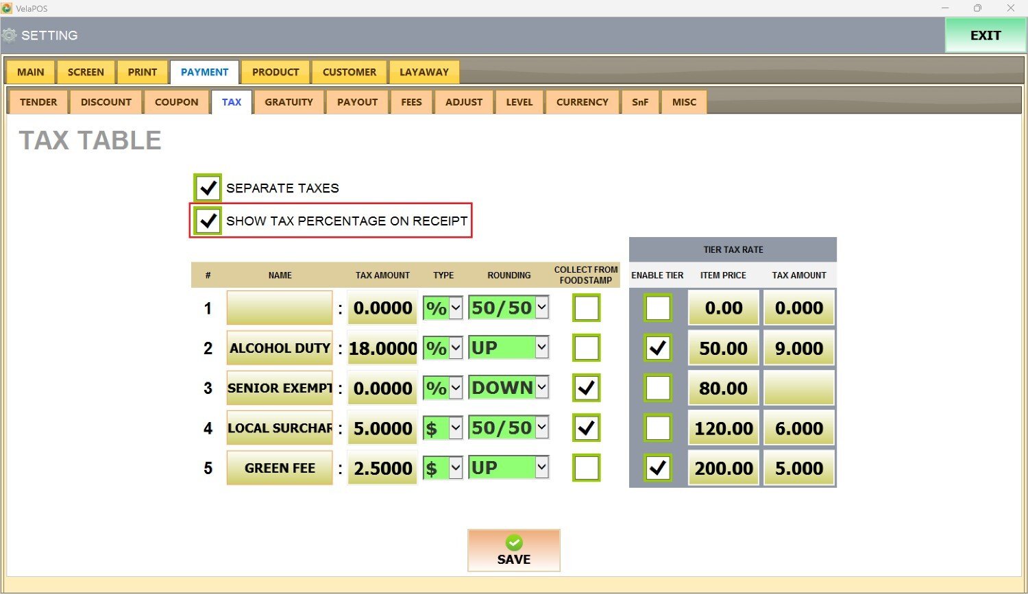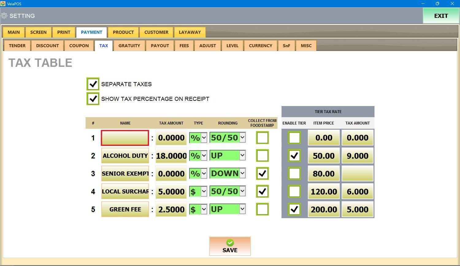 Main Screen> MENU> SETTINGS> PAYMENT> TAX
