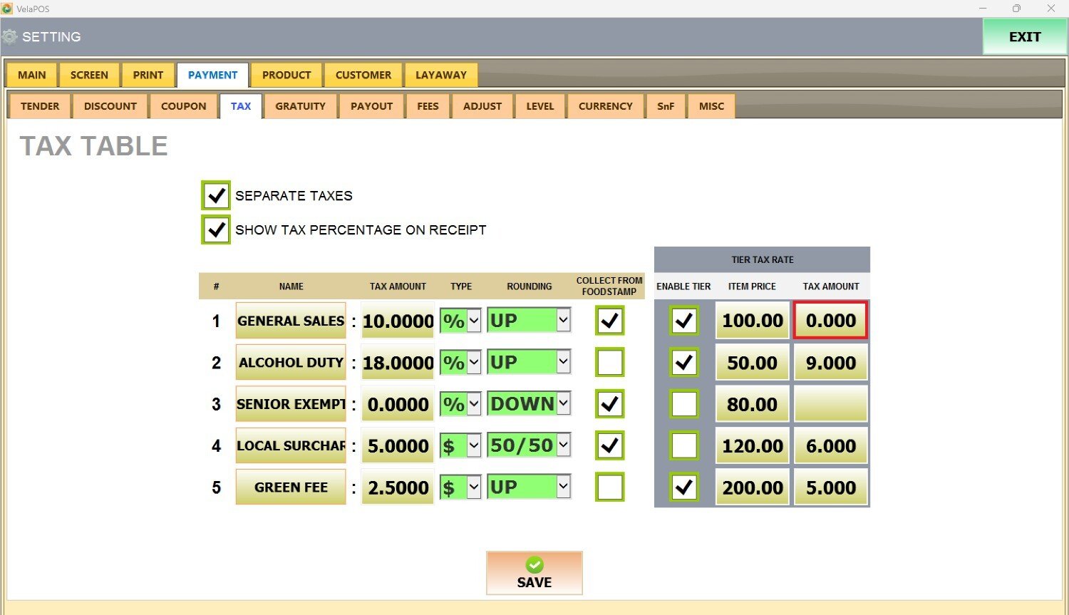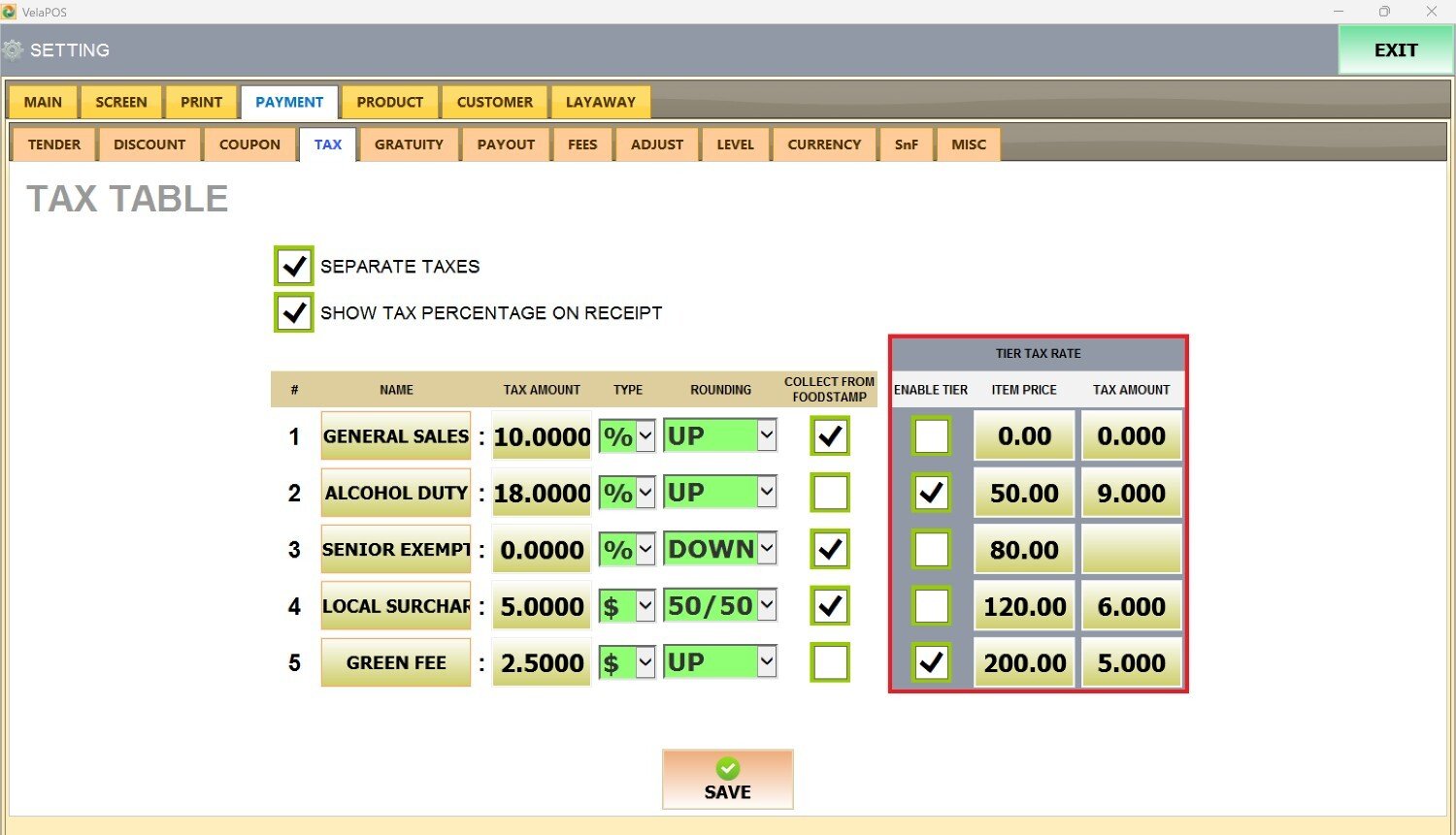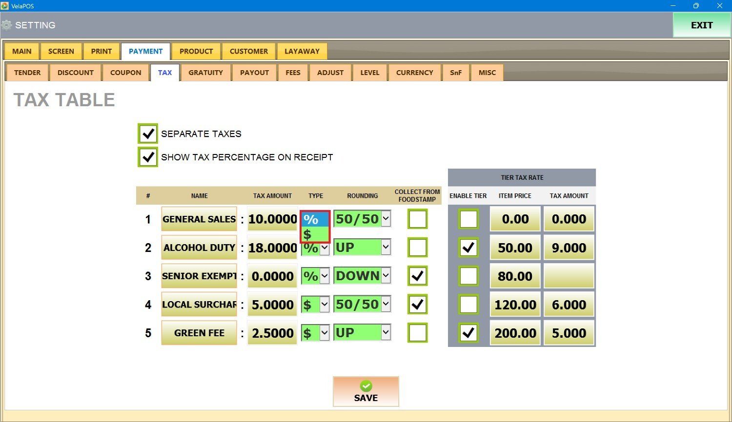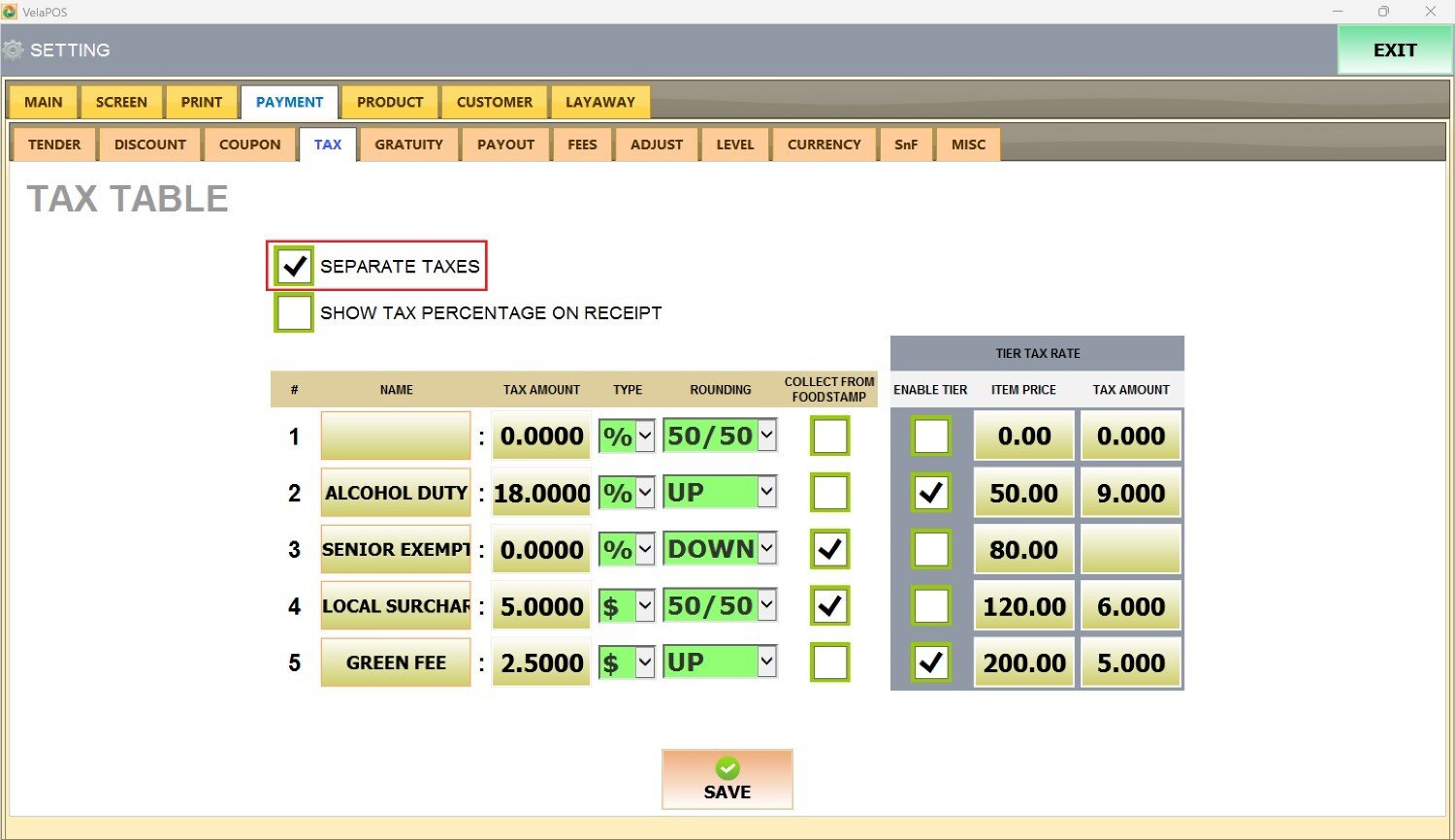 Main Screen> MENU> SETTINGS> PAYMENT> TAX