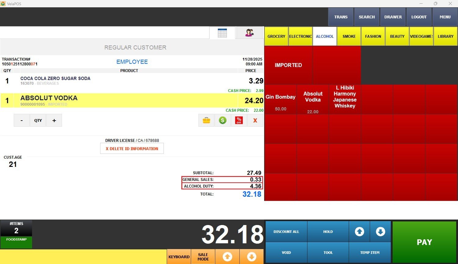 The tax percentage is shown next to each applicable item on the receipt.