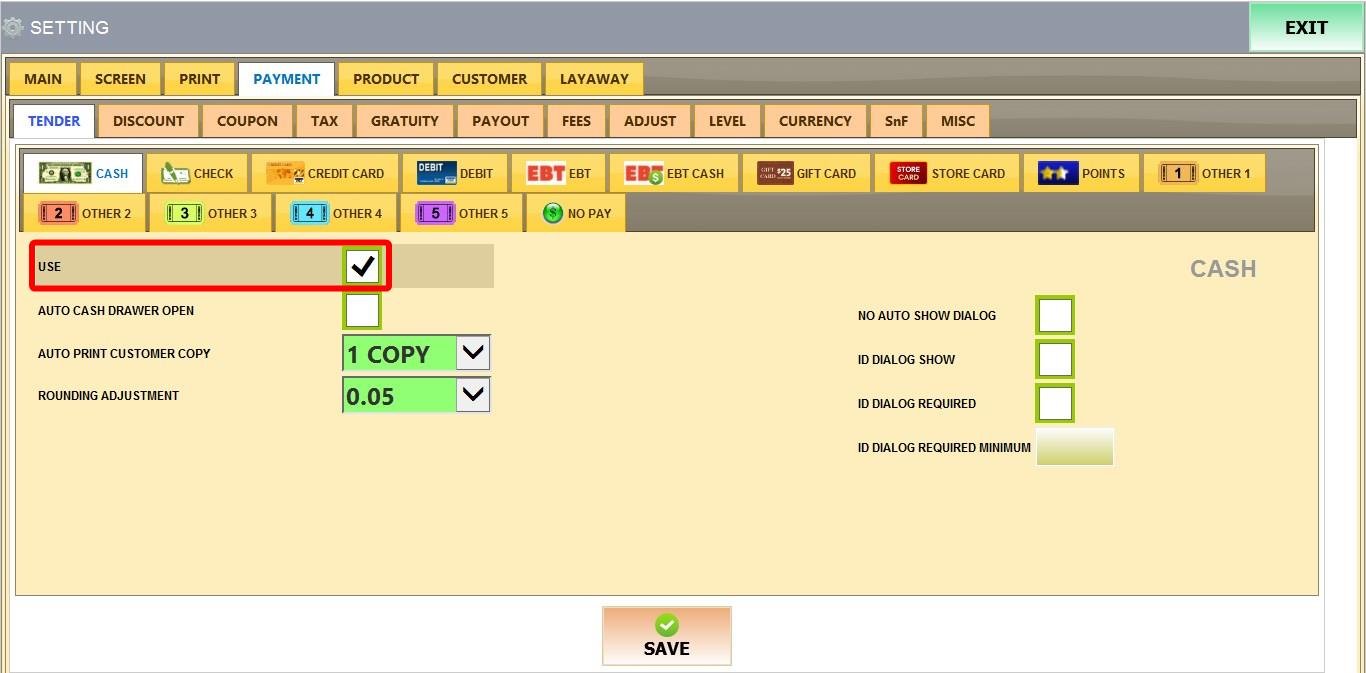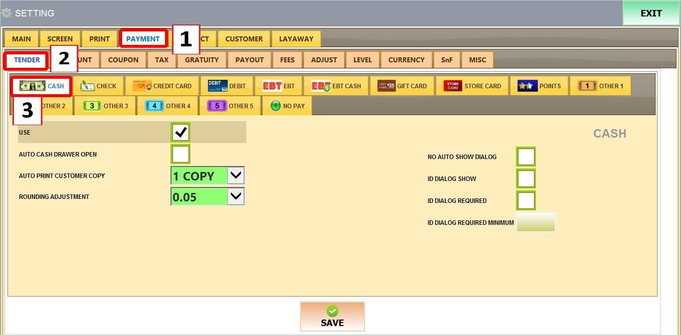 Main Screen > MENU > SETTINGS > PAYMENT > TENDER > CASH