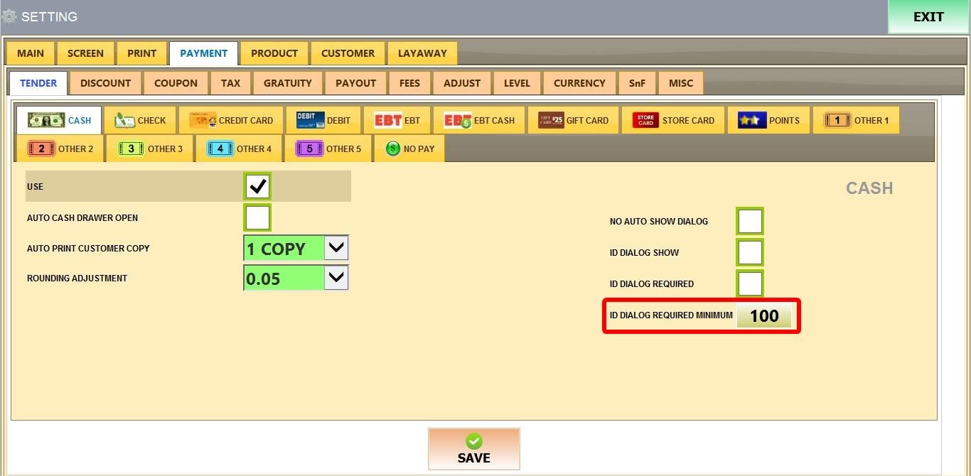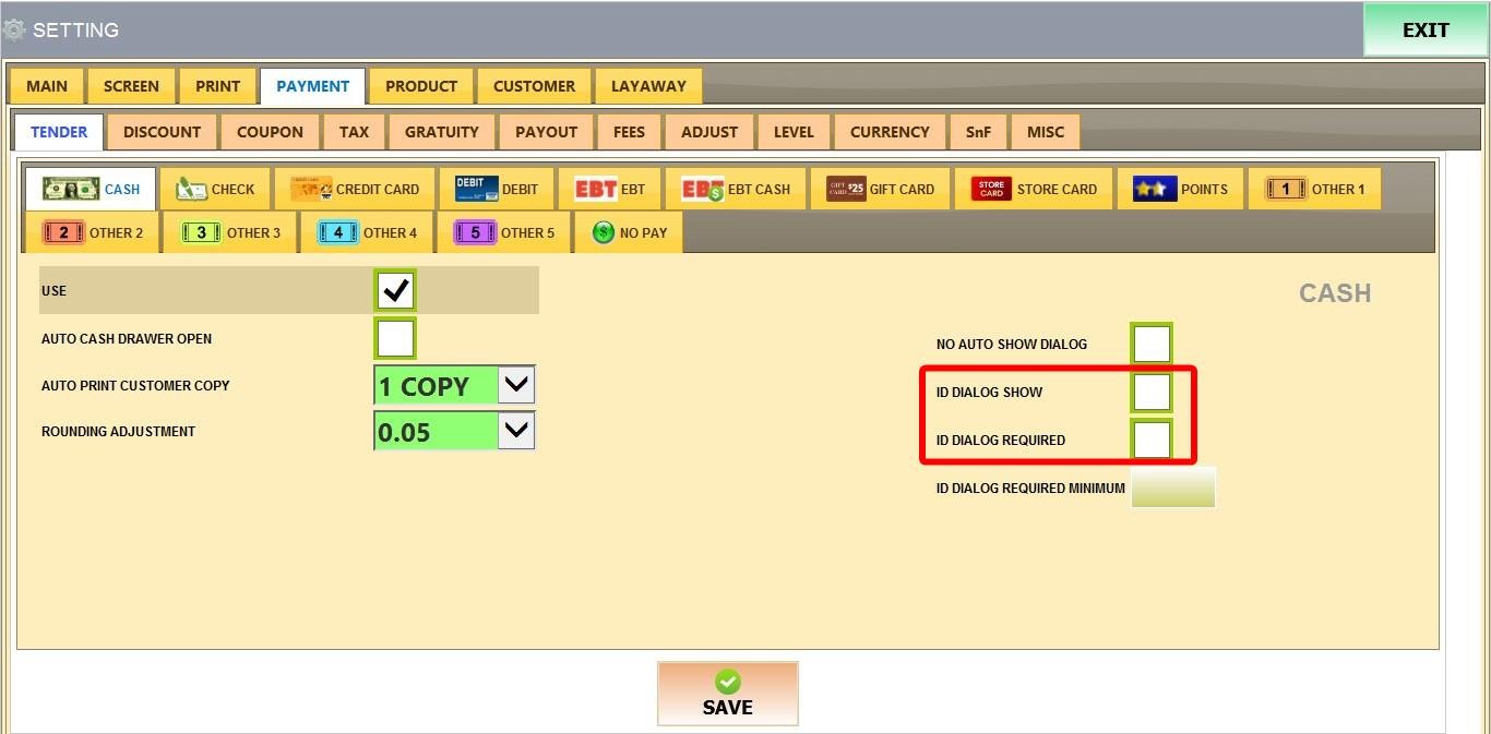 7. ID DIALOG REQUIRED: Requires the cashier to enter a Customer ID to complete the cash payment.