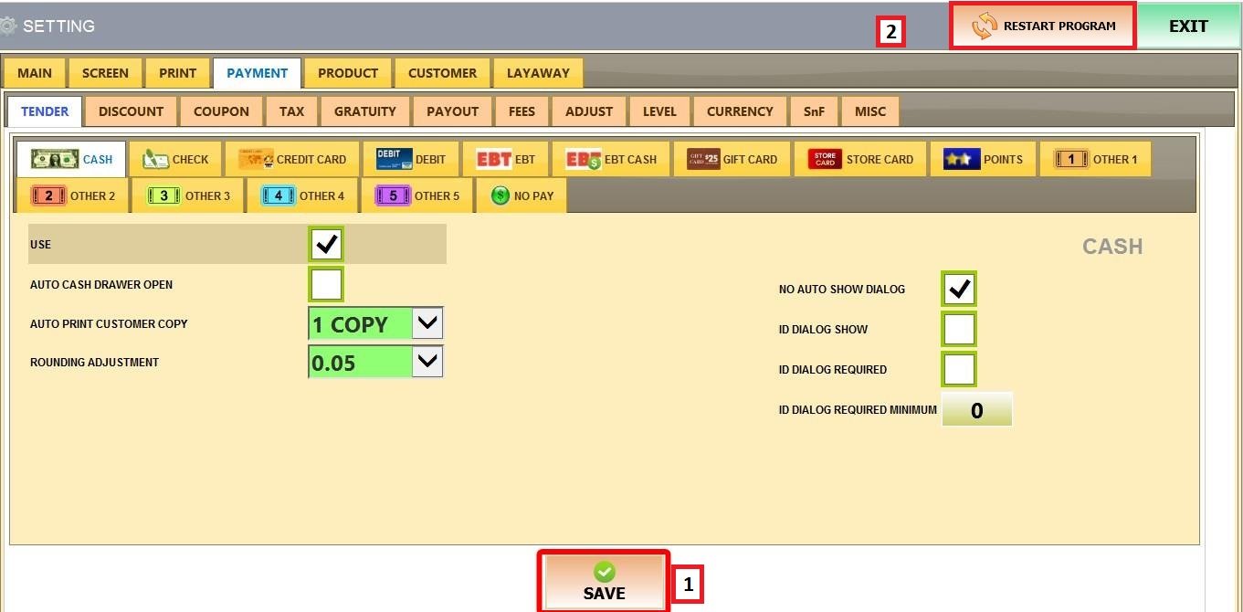 5. NO AUTO SHOW DIALOG: When enabled, the transaction completes using the exact amount due unless the amount is manually changed.