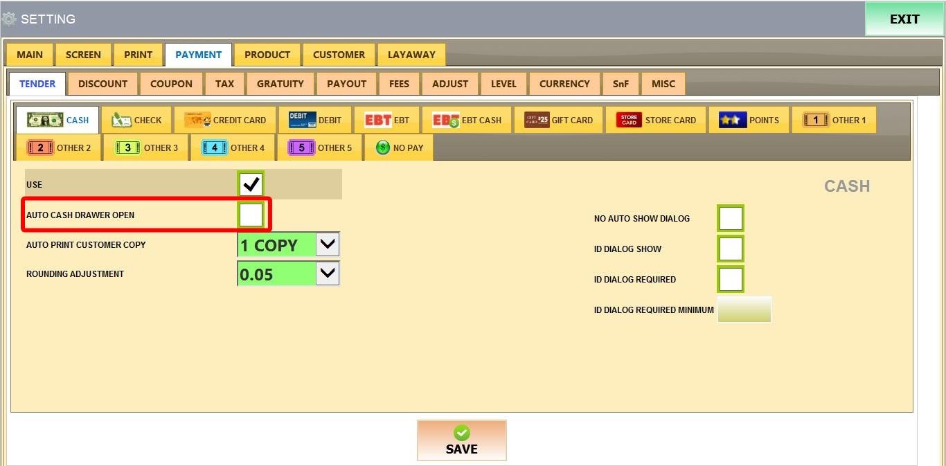 2. AUTO CASH DRAWER OPEN: Automatically opens the cash drawer when a cash payment is completed.