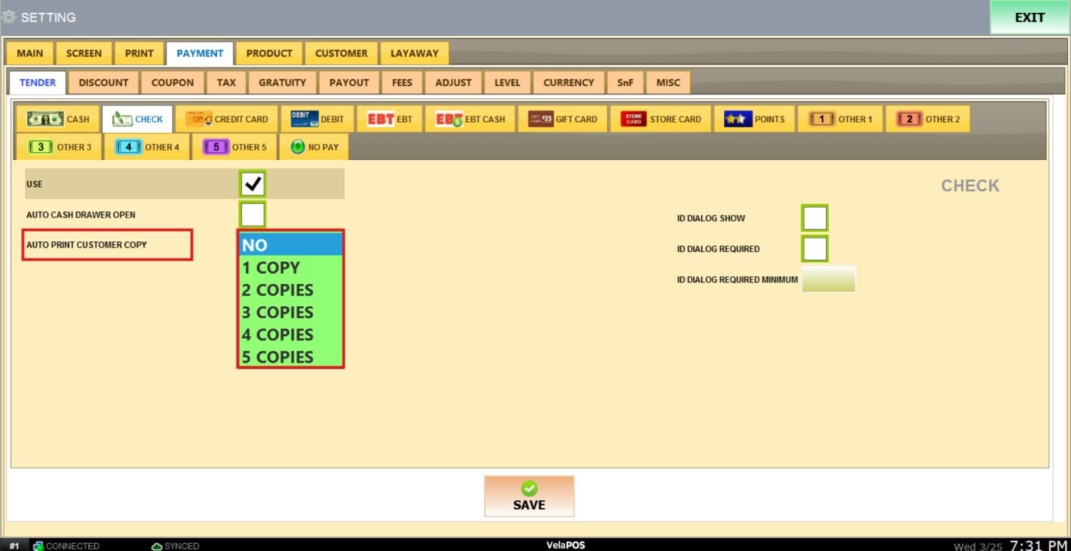 AUTO PRINT CUSTOMER COPY: Sets how many customer receipts print automatically after a check transaction. Options range from NO (0 copies) up to 5 copies.