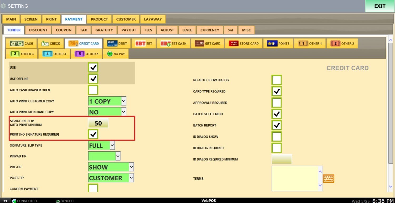 SIGNATURE SLIP AUTO PRINT MINIMUM: Defines the minimum transaction amount required for the system to automatically print a signature slip.