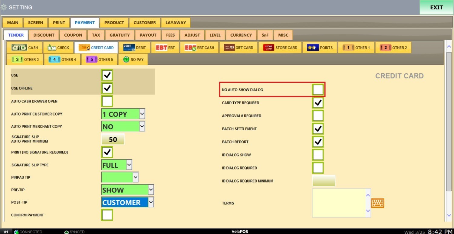 NO AUTO SHOW DIALOG: Prevents automatic display of approval or ID confirmation dialogs after card transactions