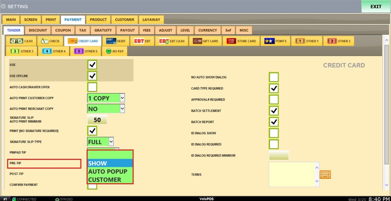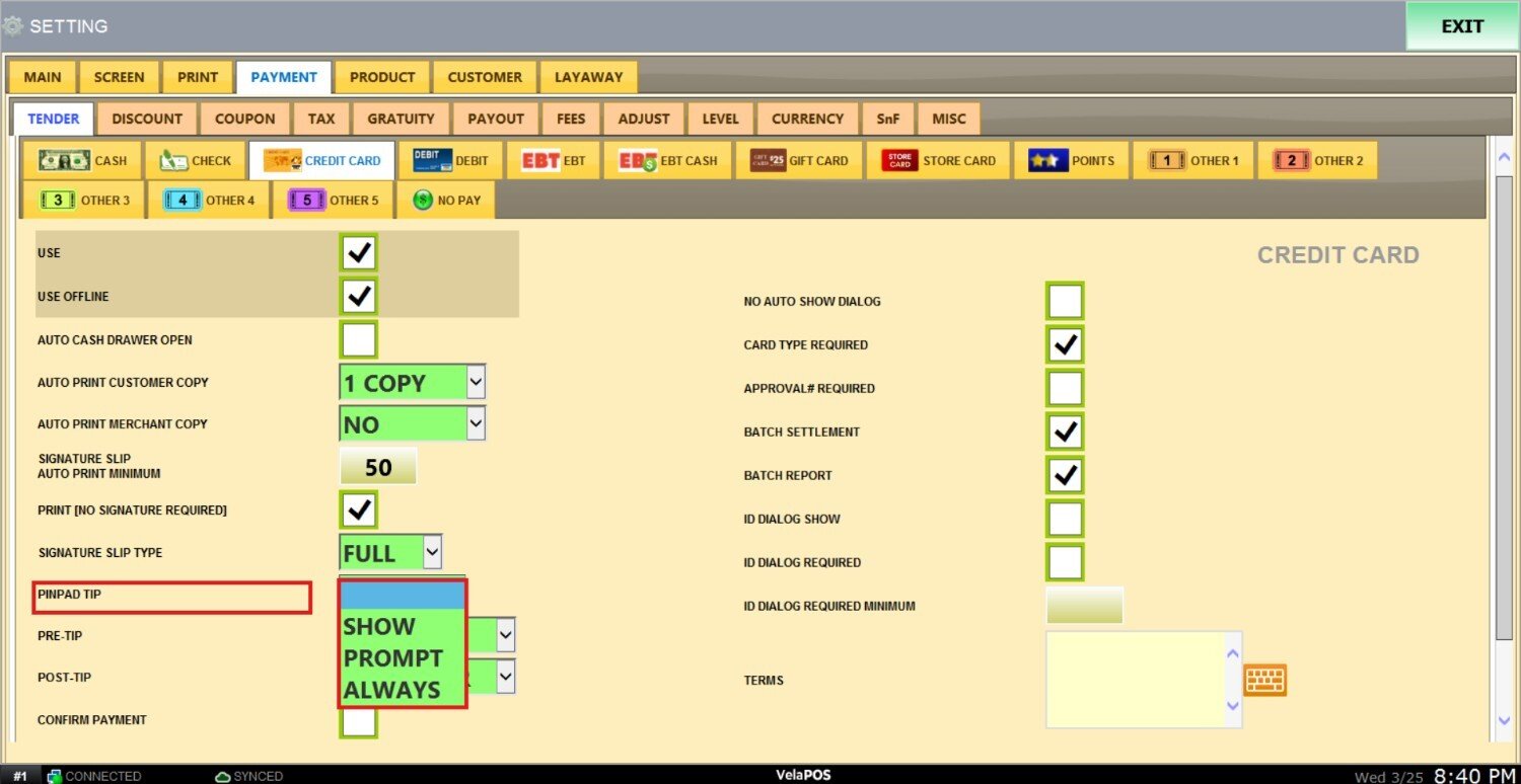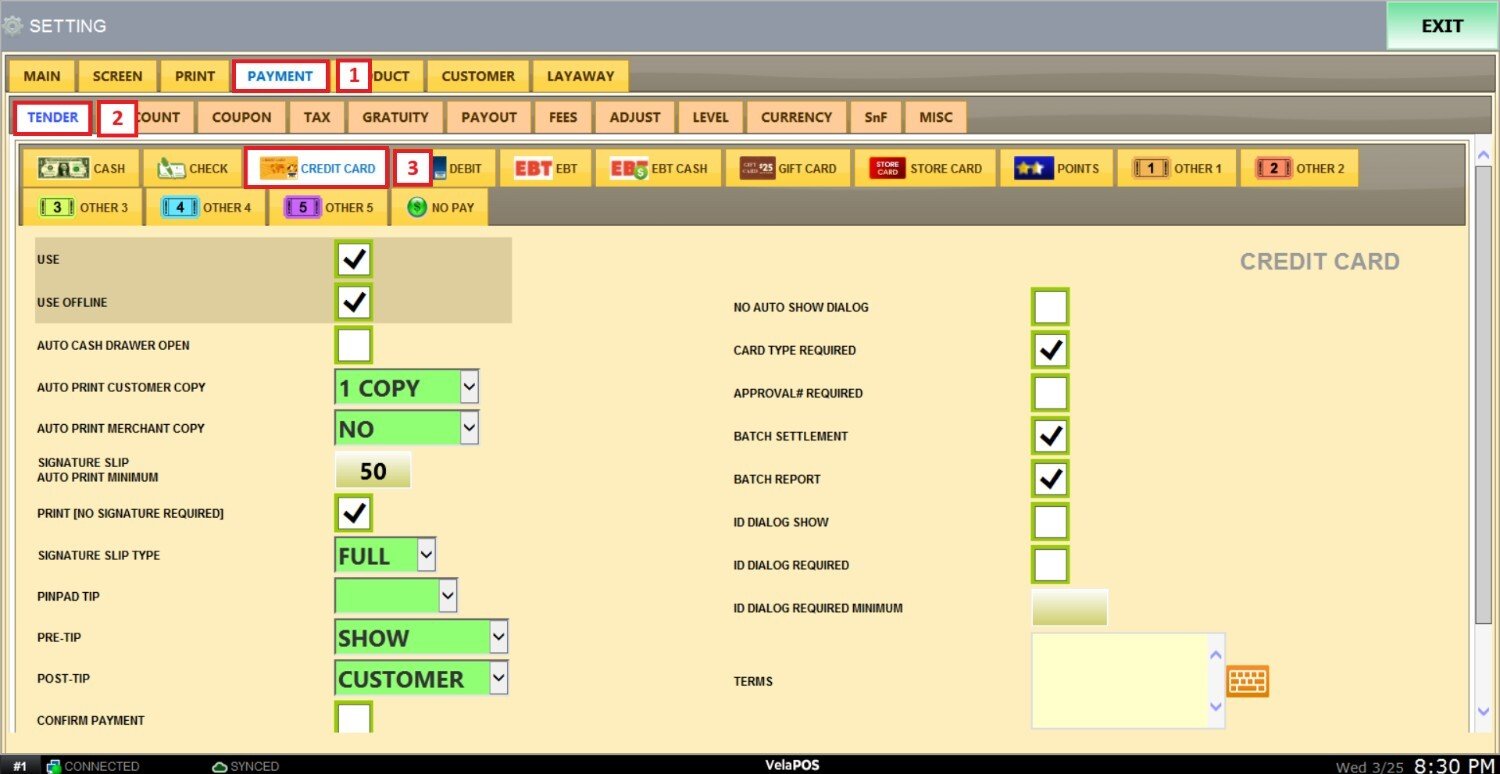 Main Screen> MENU>SETTINGS> PAYMENT> TENDER> CREDIT CARD