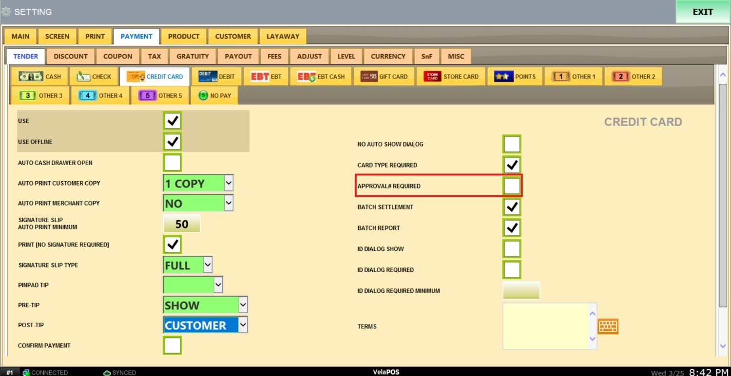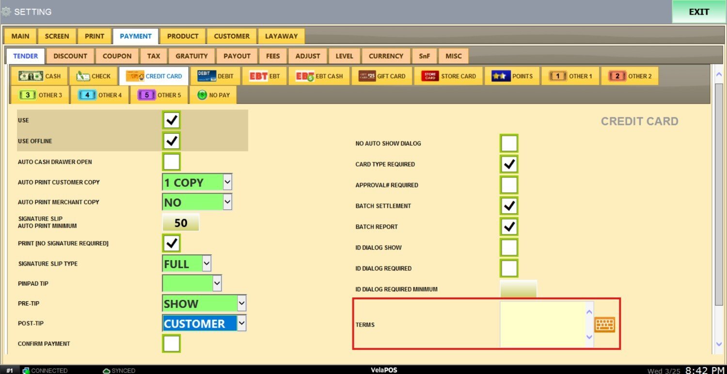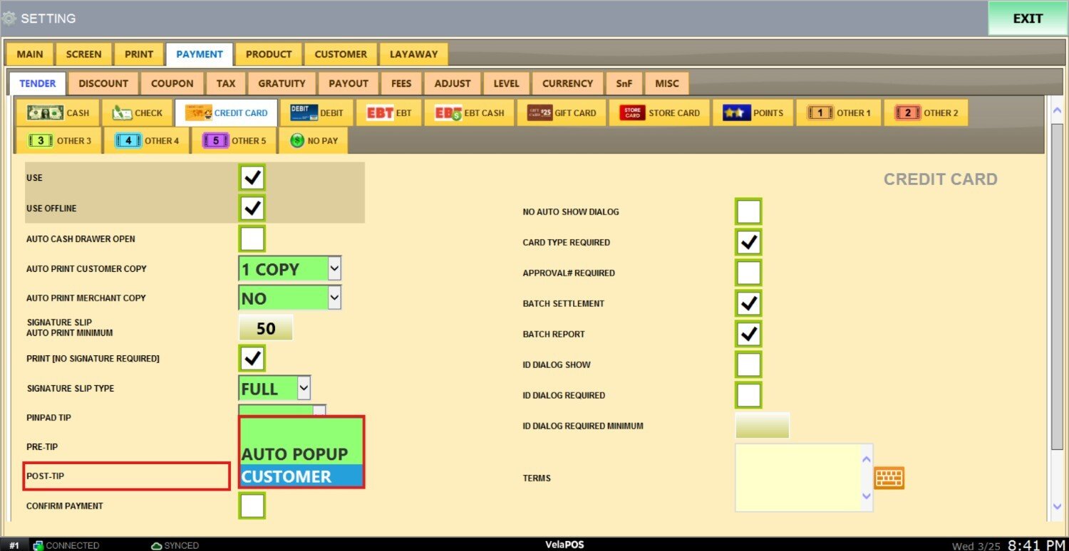 Main Screen> MENU>SETTINGS> PAYMENT> TENDER> CREDIT CARD