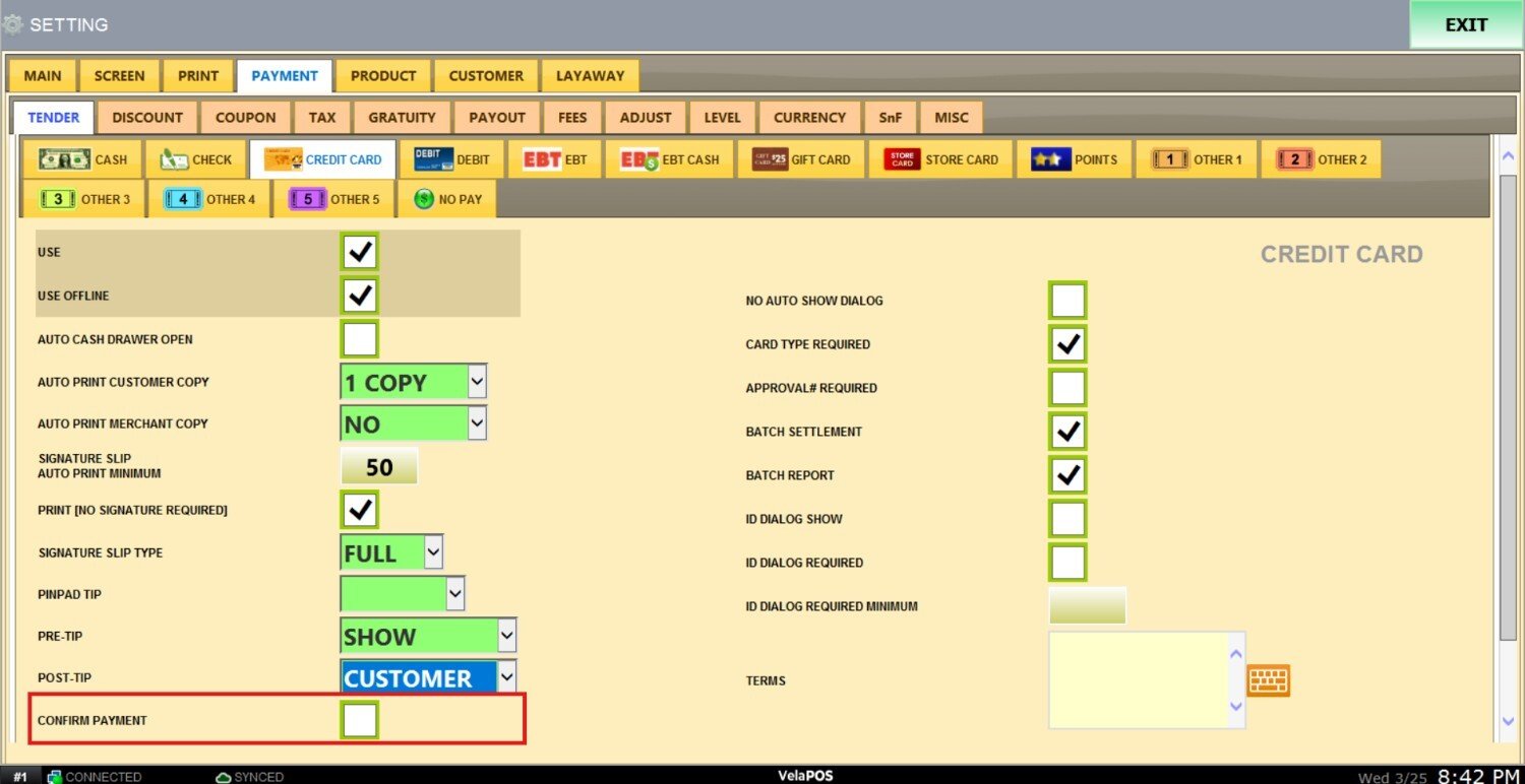 CONFIRM PAYMENT: Requires manual confirmation on the POS screen before completing a credit transaction.