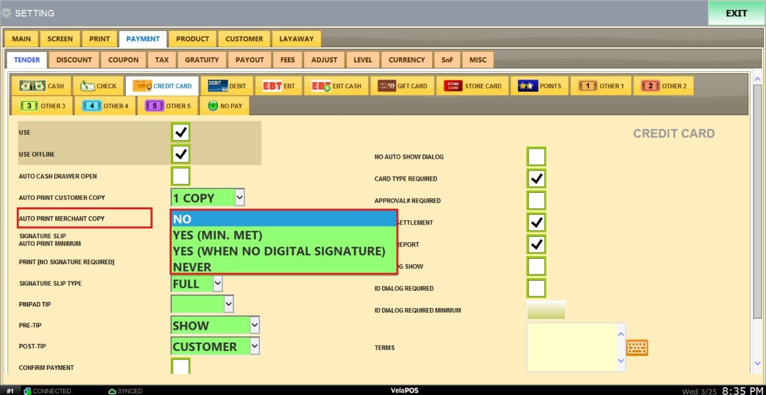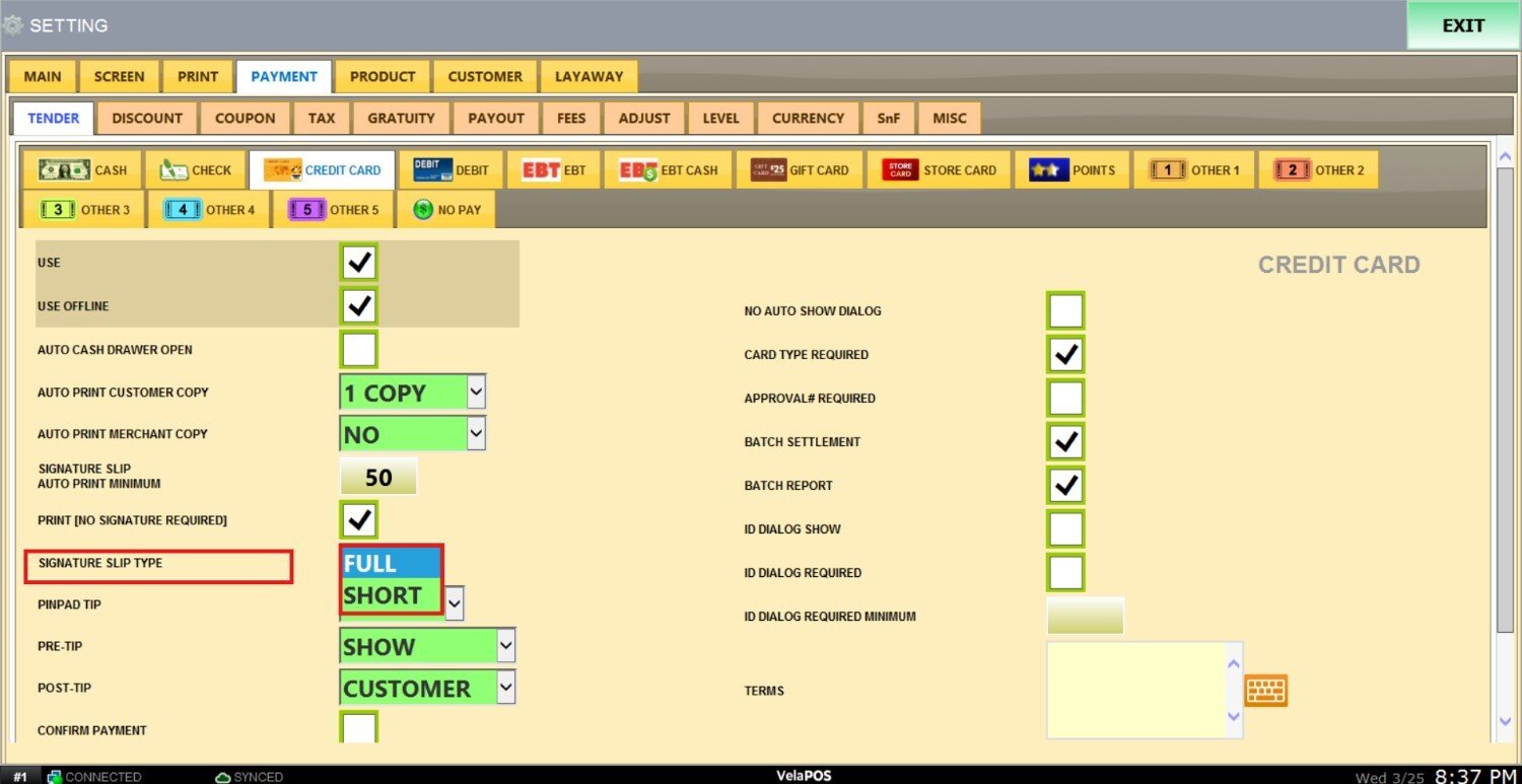 SIGNATURE SLIP TYPE: Allows you to select the format of the signature slip that will be printed for credit card transactions.