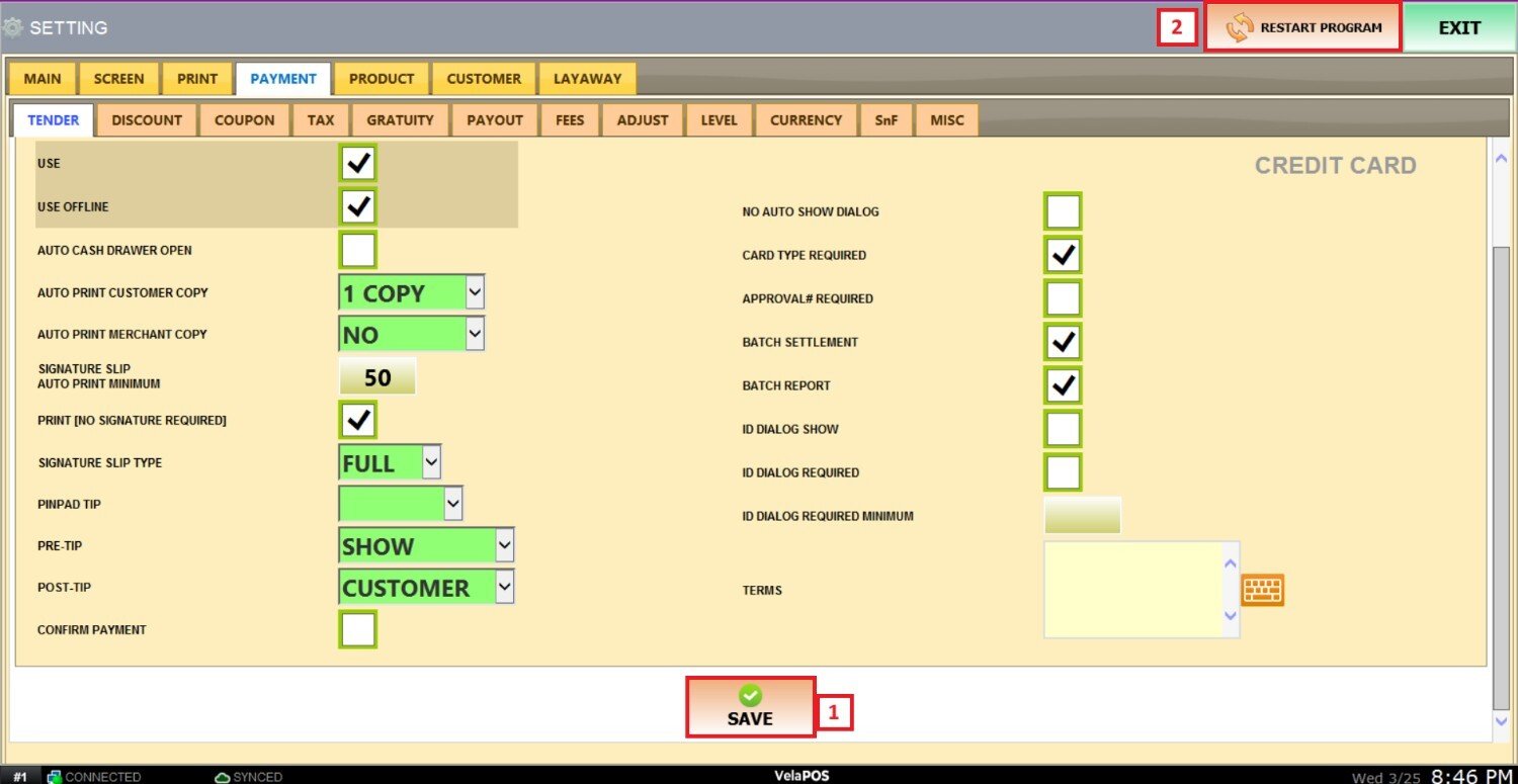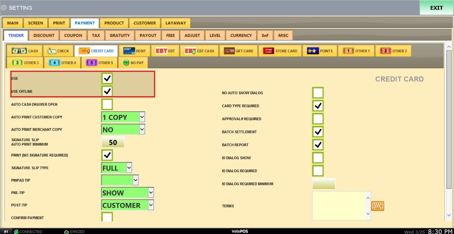 USE OFFLINE: Allows credit transactions to be processed even if the POS temporarily loses connection.