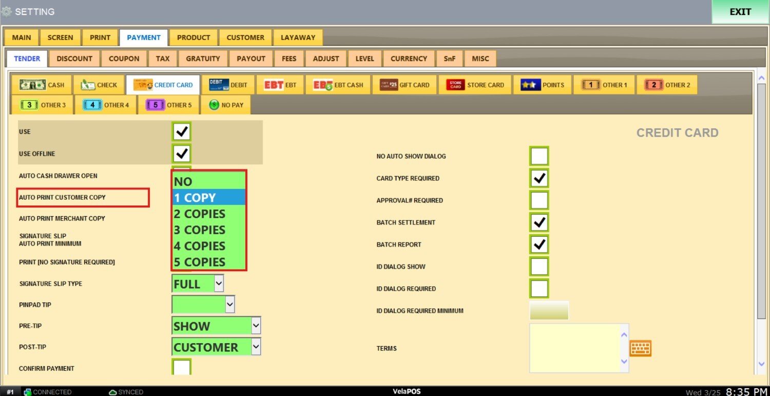 AUTO PRINT CUSTOMER COPY: Sets how many customer receipt copies print automatically.