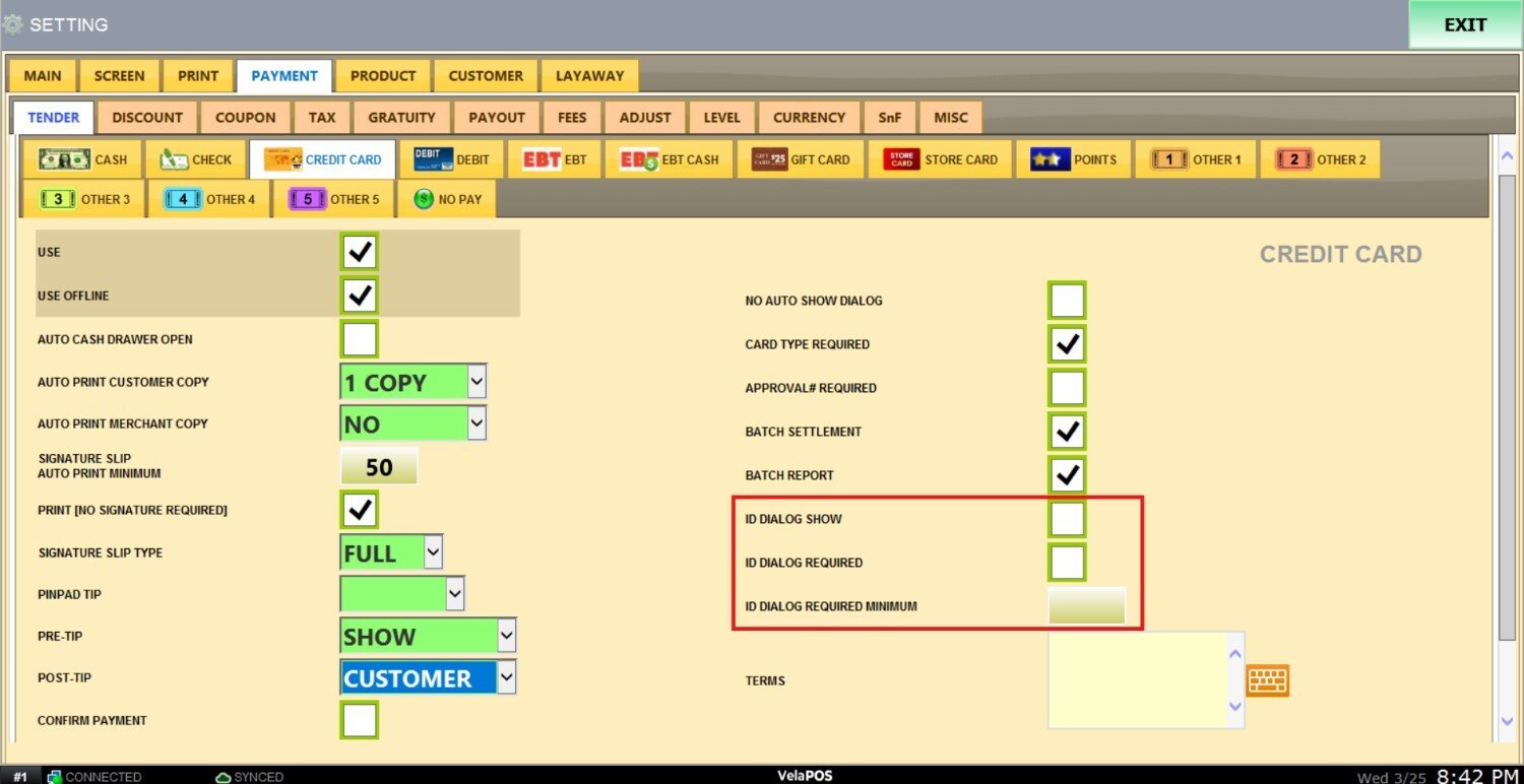 ID DIALOG SHOW/REQUIRED/REQUIRED MINIMUM: Controls ID verification prompts during transactions, including whether ID is optional, required, or required above a certain amount.