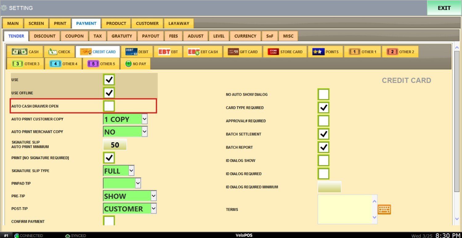 AUTO CASH DRAWER OPEN: Automatically opens the cash drawer after a credit transaction is completed.
