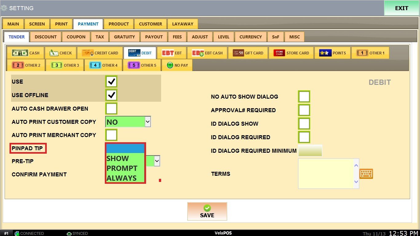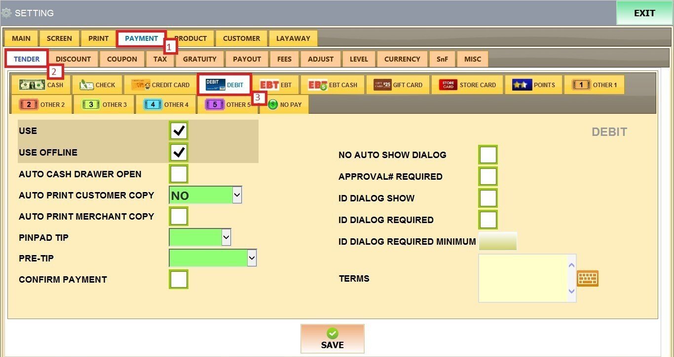 Main Screen> MENU>SETTINGS> PAYMENT> TENDER> DEBIT