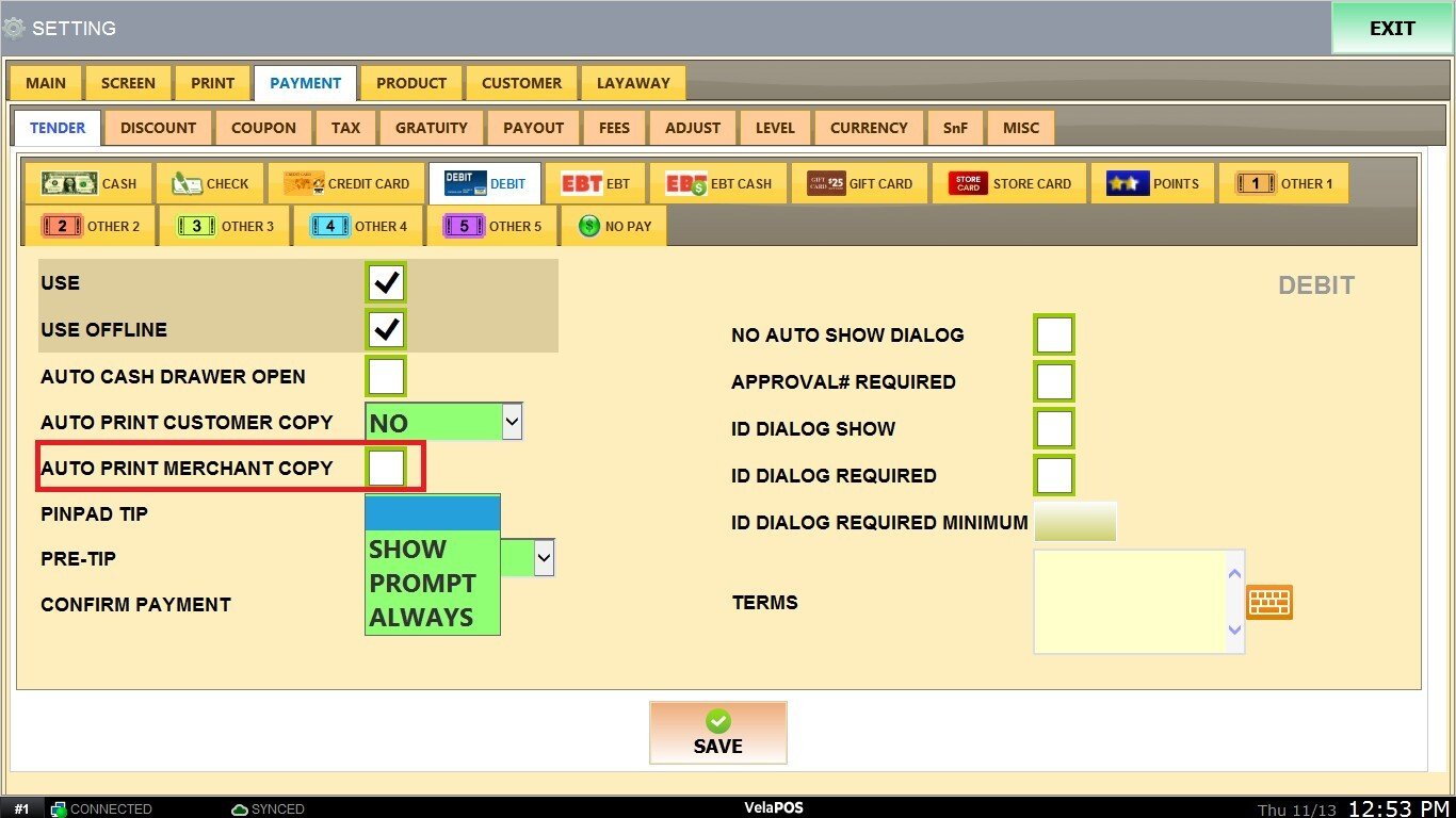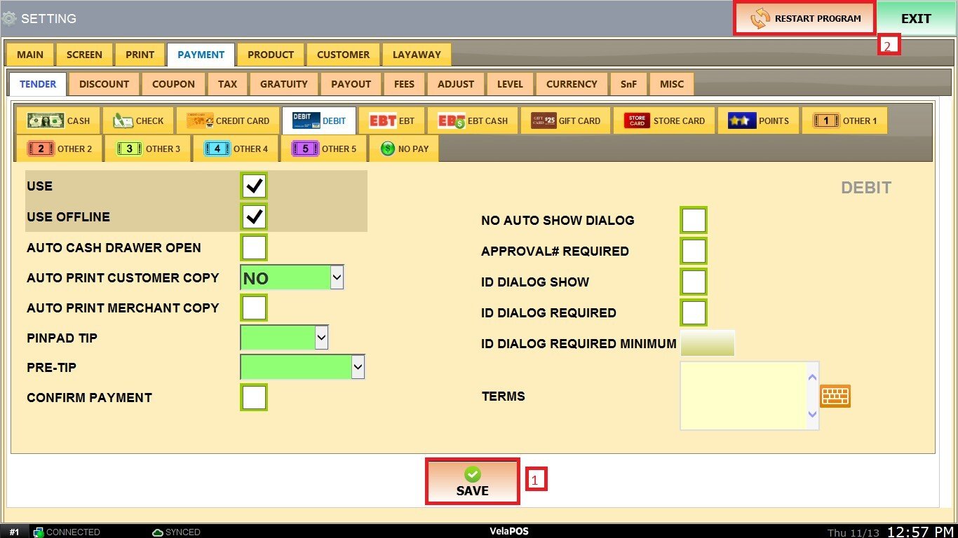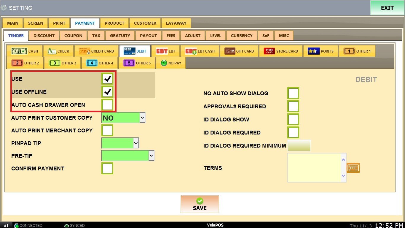 USE OFFLINE: Allows debit transactions to be processed even if the POS temporarily loses connection.