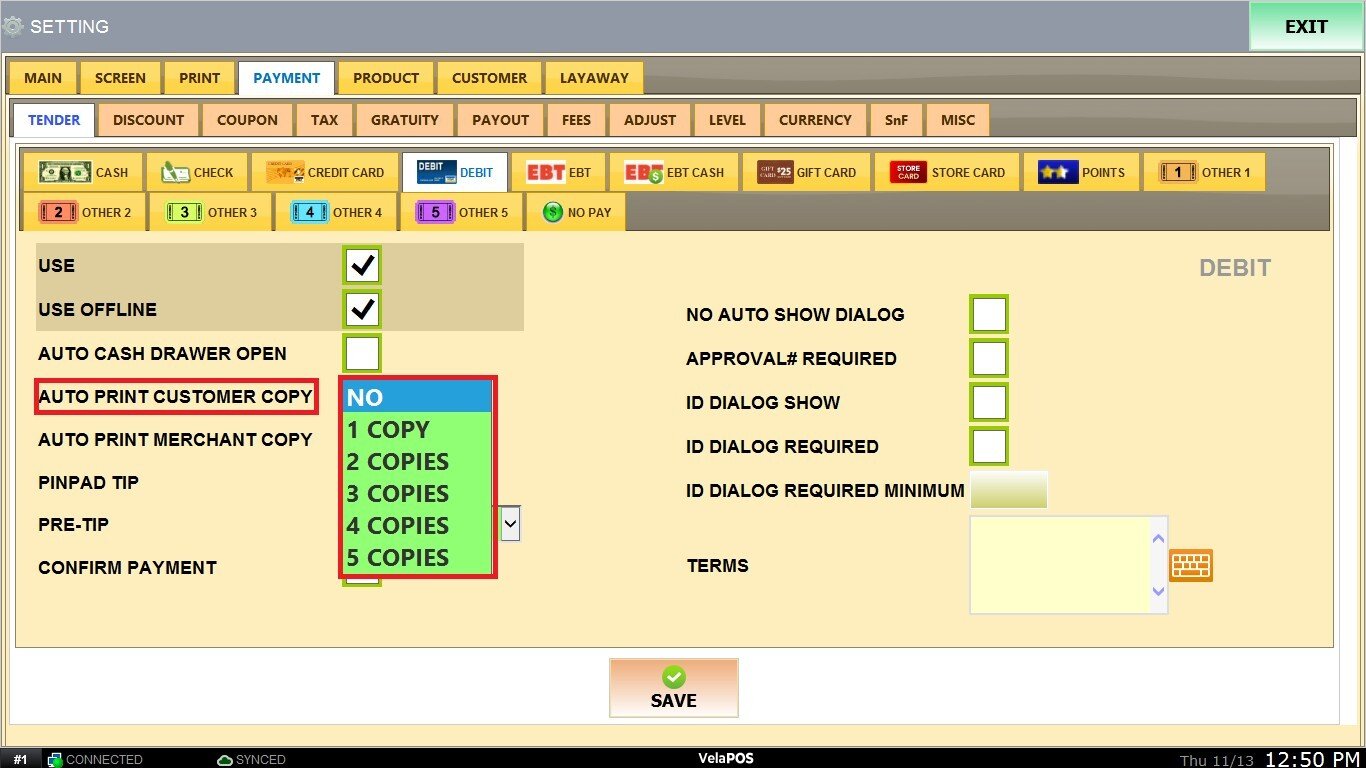 AUTO PRINT CUSTOMER COPY: Sets how many customer receipt copies print automatically.