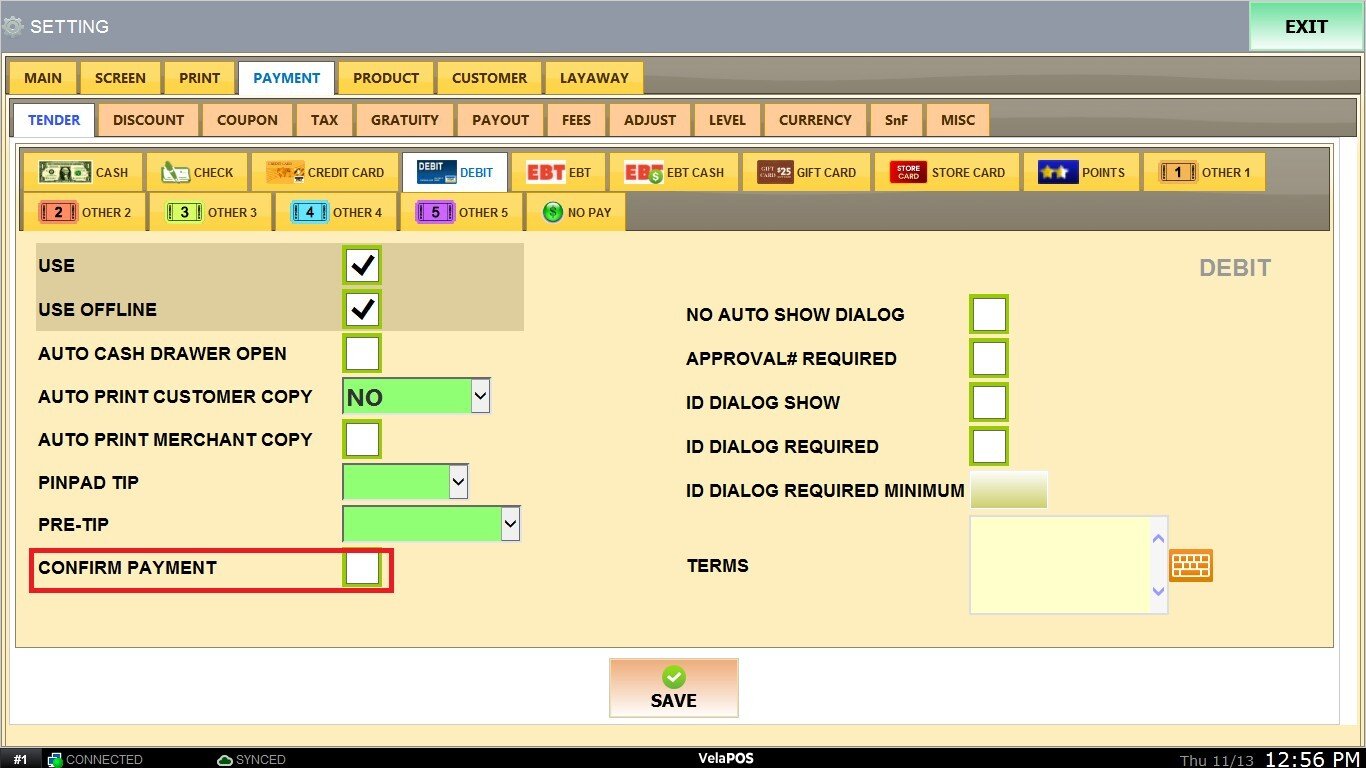 CONFIRM PAYMENT: Requires manual confirmation on the POS screen before completing a debit transaction.