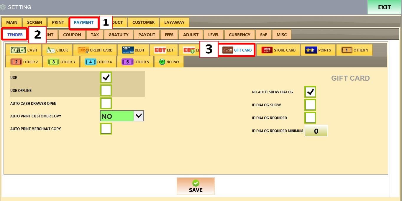 Main Screein > MENU > SETTINGS > PAYMENT > TENDER > GIFT CARD