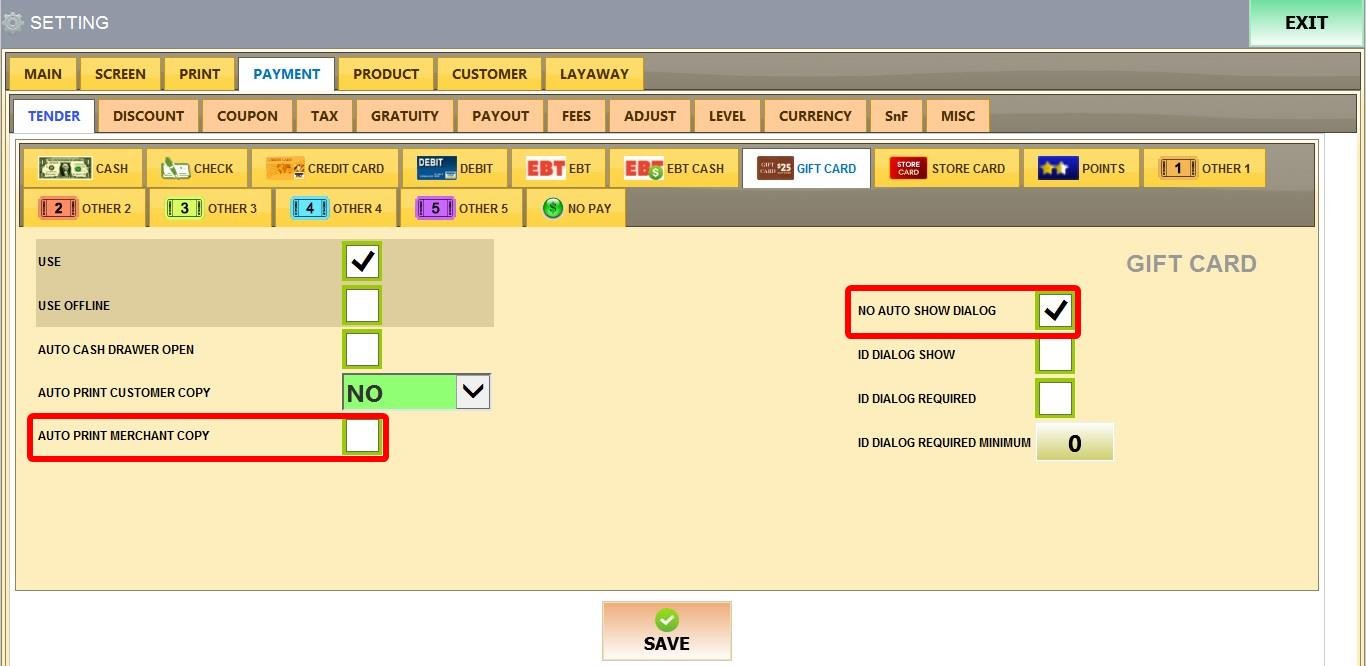 6. NO AUTO SHOW DIALOG: When enabled, the system will not automatically display the gift card balance window when processing a gift card payment.