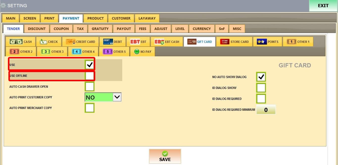 8. ID DIALOG REQUIRED: Makes entering customer ID mandatory to complete gift card payment.