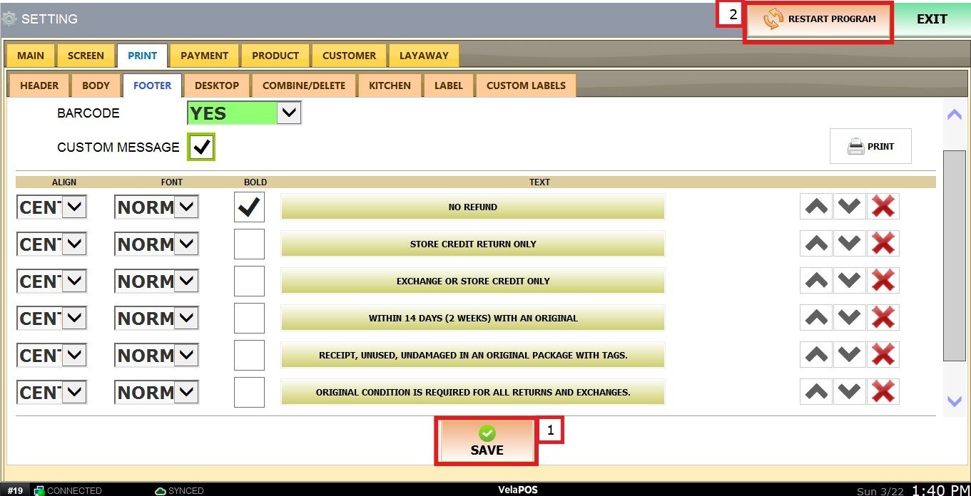 Once all information has been entered and the custom message is configured, click on SAVE and RESTART THE PROGRAM.