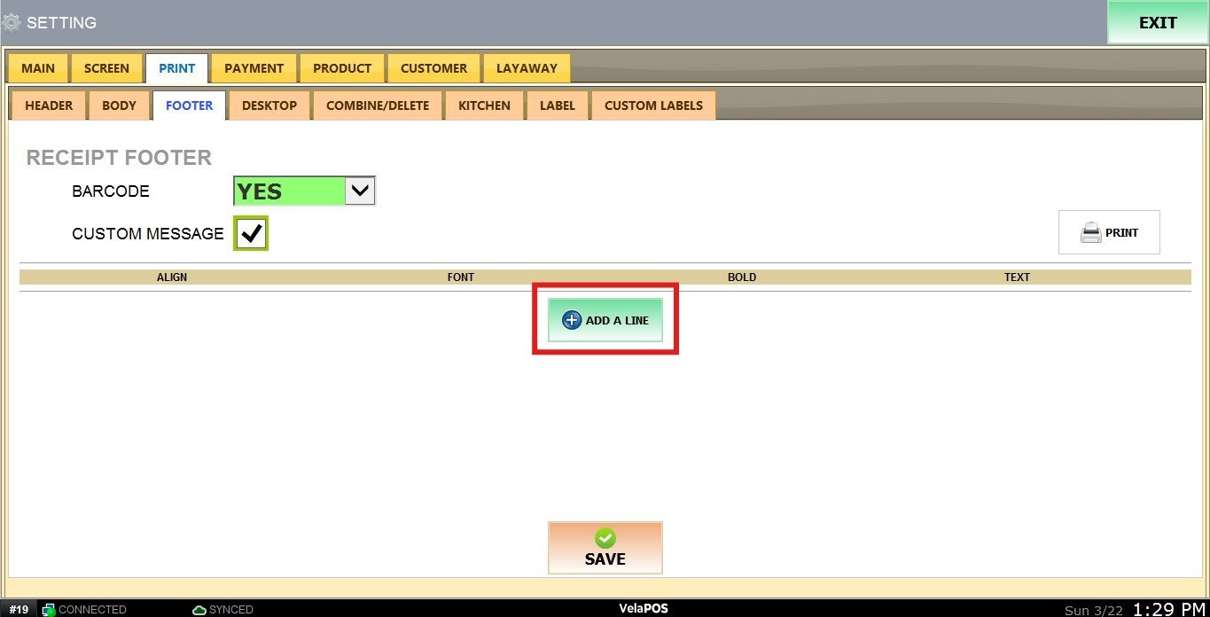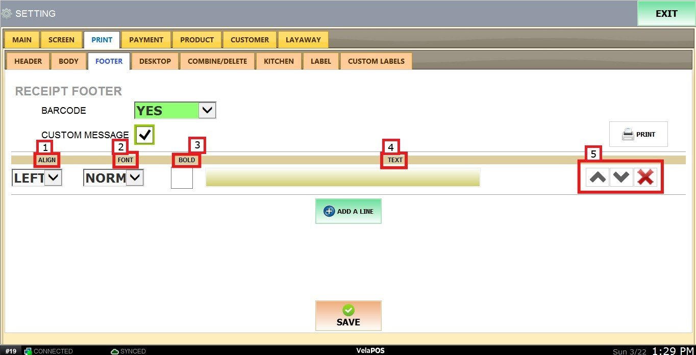 Main Screen > MENU> SETTING> PRINT> FOOTER> CUSTOM MESSAGE