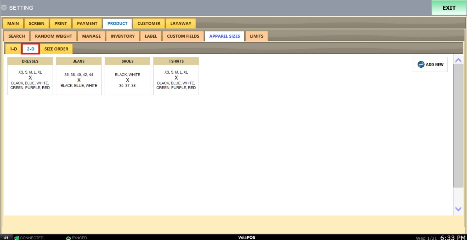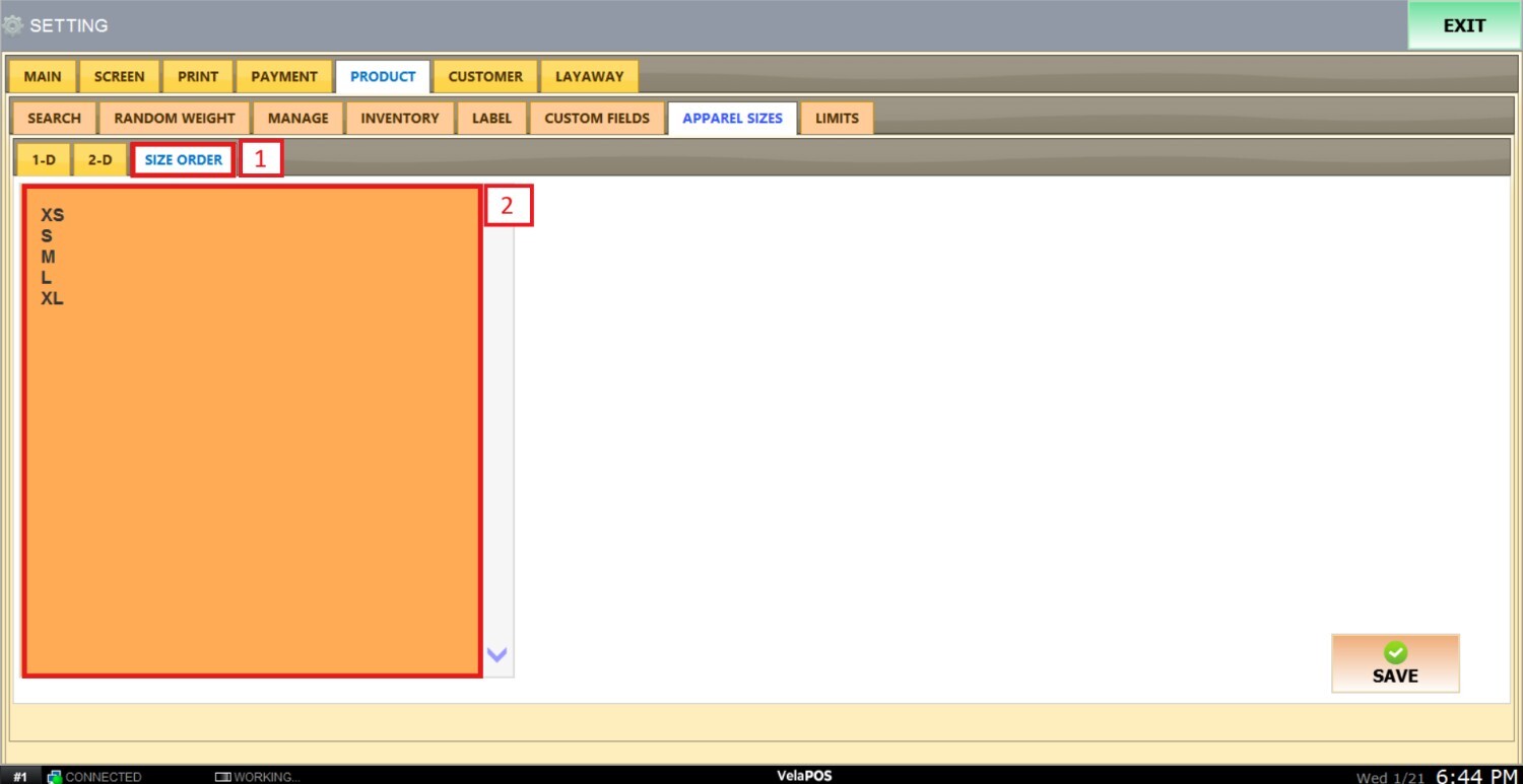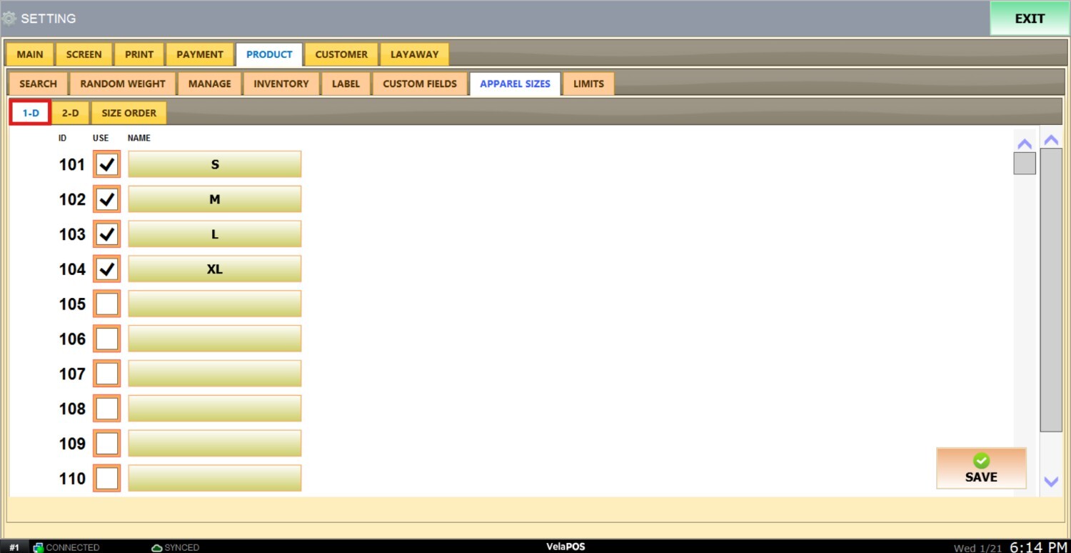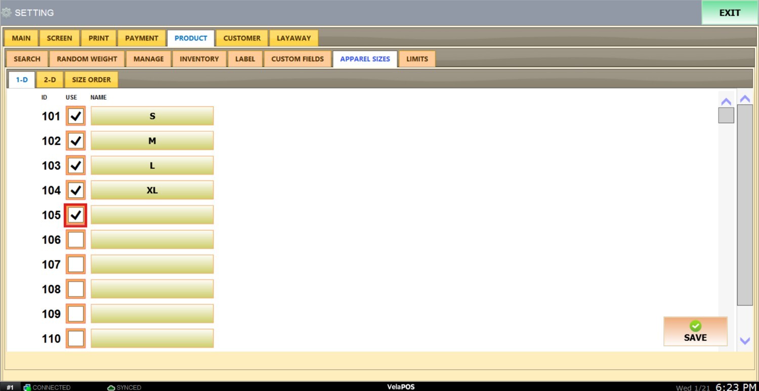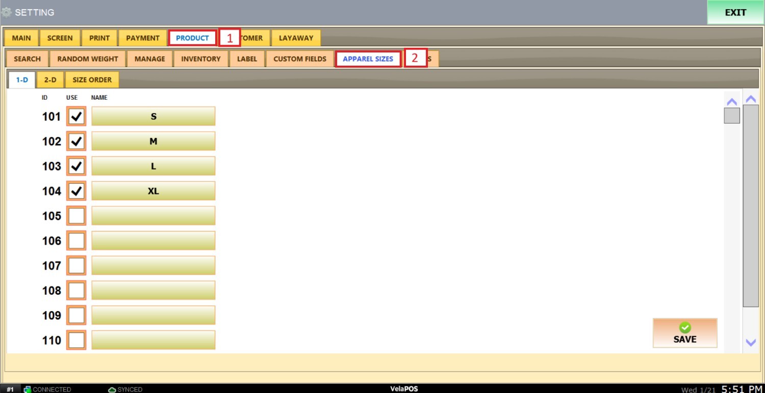 Main screen > MENU > SETTINGS > PRODUCT > APPAREL SIZES