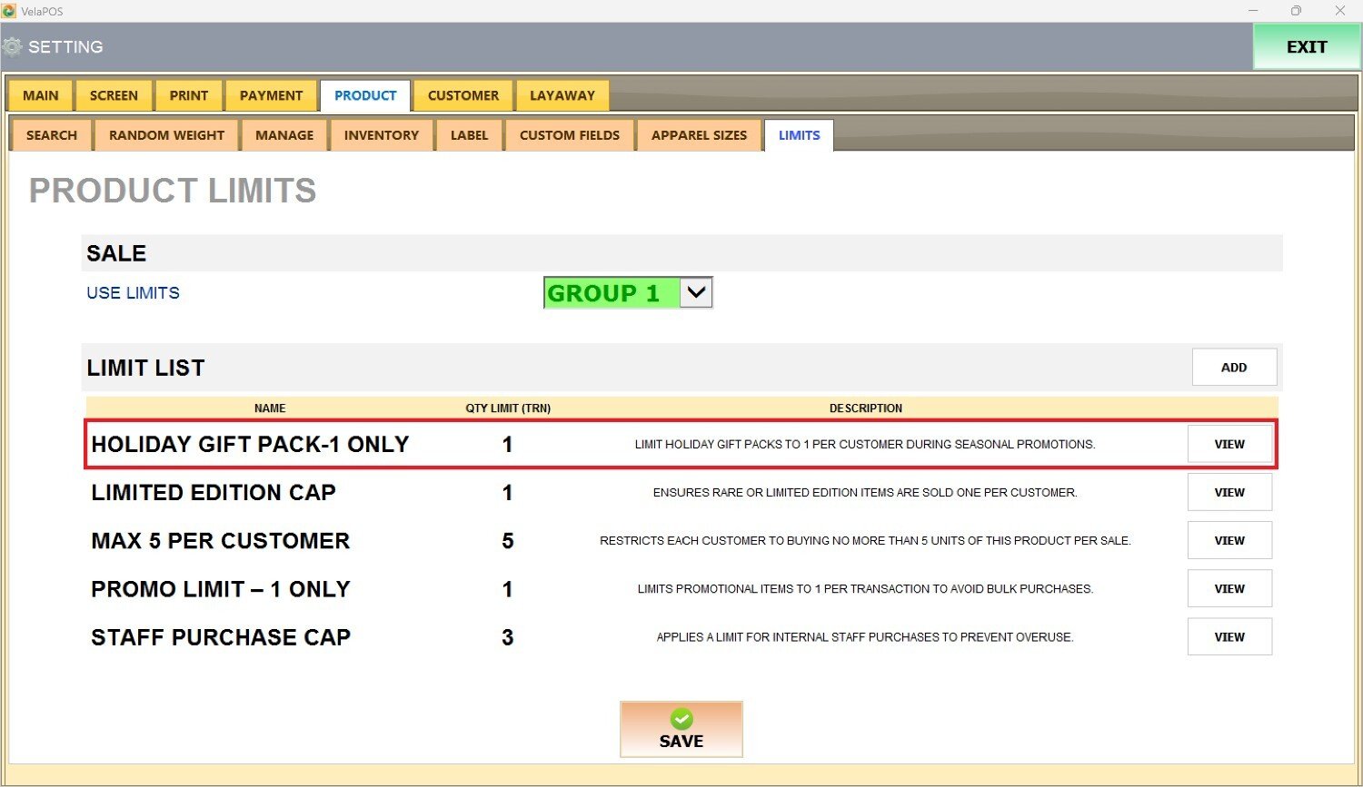 2. QTY LIMIT PER TRANSACTION: Define the maximum quantity of a product that can be sold within a single transaction.