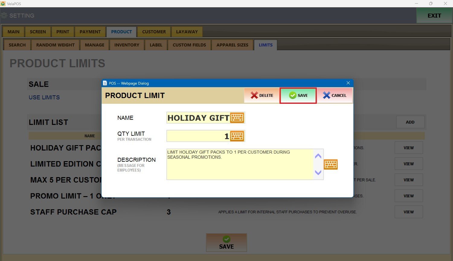 3. DESCRIPTION (MESSAGE FOR EMPLOYEES): Add a short note explaining the purpose of the limit. This helps staff understand the policy and communicate it to customers if needed.