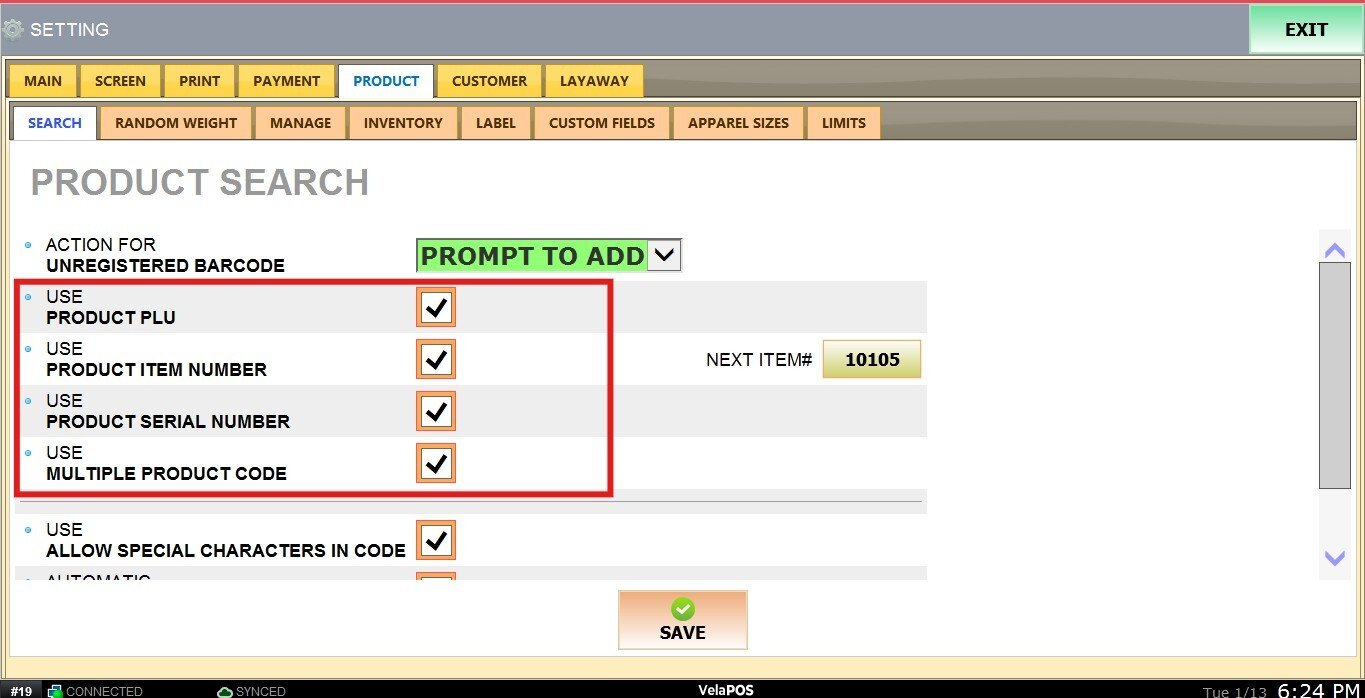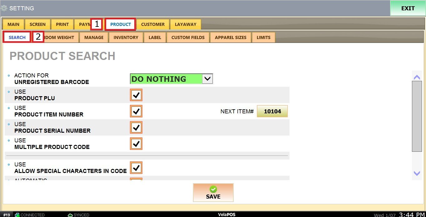 The Product Search settings control how VelaPOS identifies and locates products within the system. This section allows you to define how products are searched, how barcodes are interpreted, and how the system responds when an unregistered barcode is scanned.