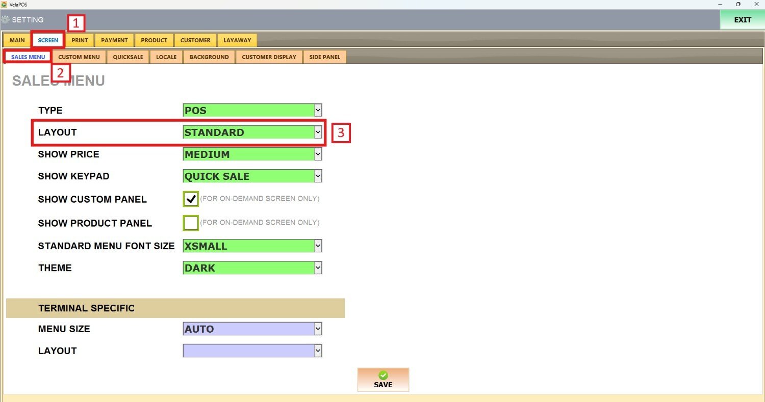 Under the SCREEN tab, select SALES MENU and navigate to the LAYOUT section.