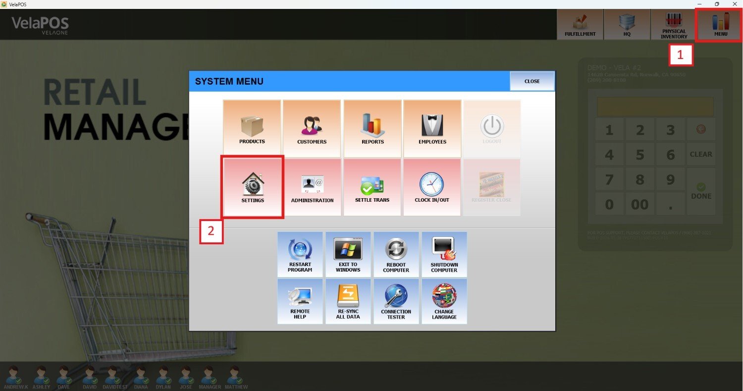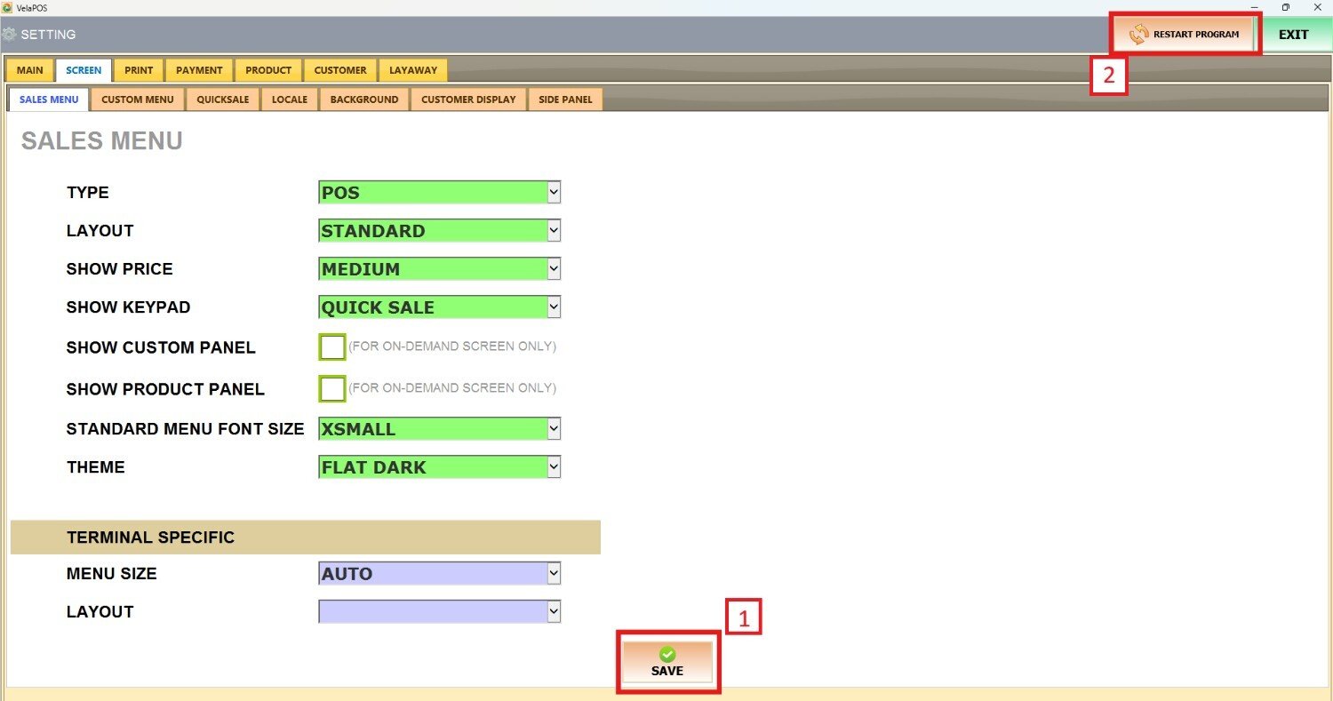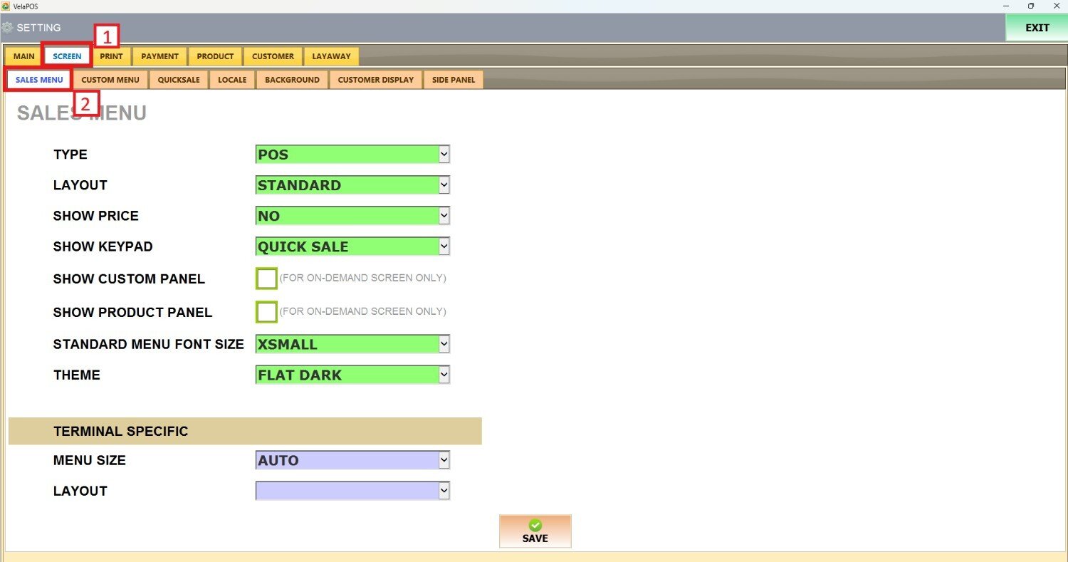 Main Screen> MENU> SETTINGS> SCREEN > SALES MENU