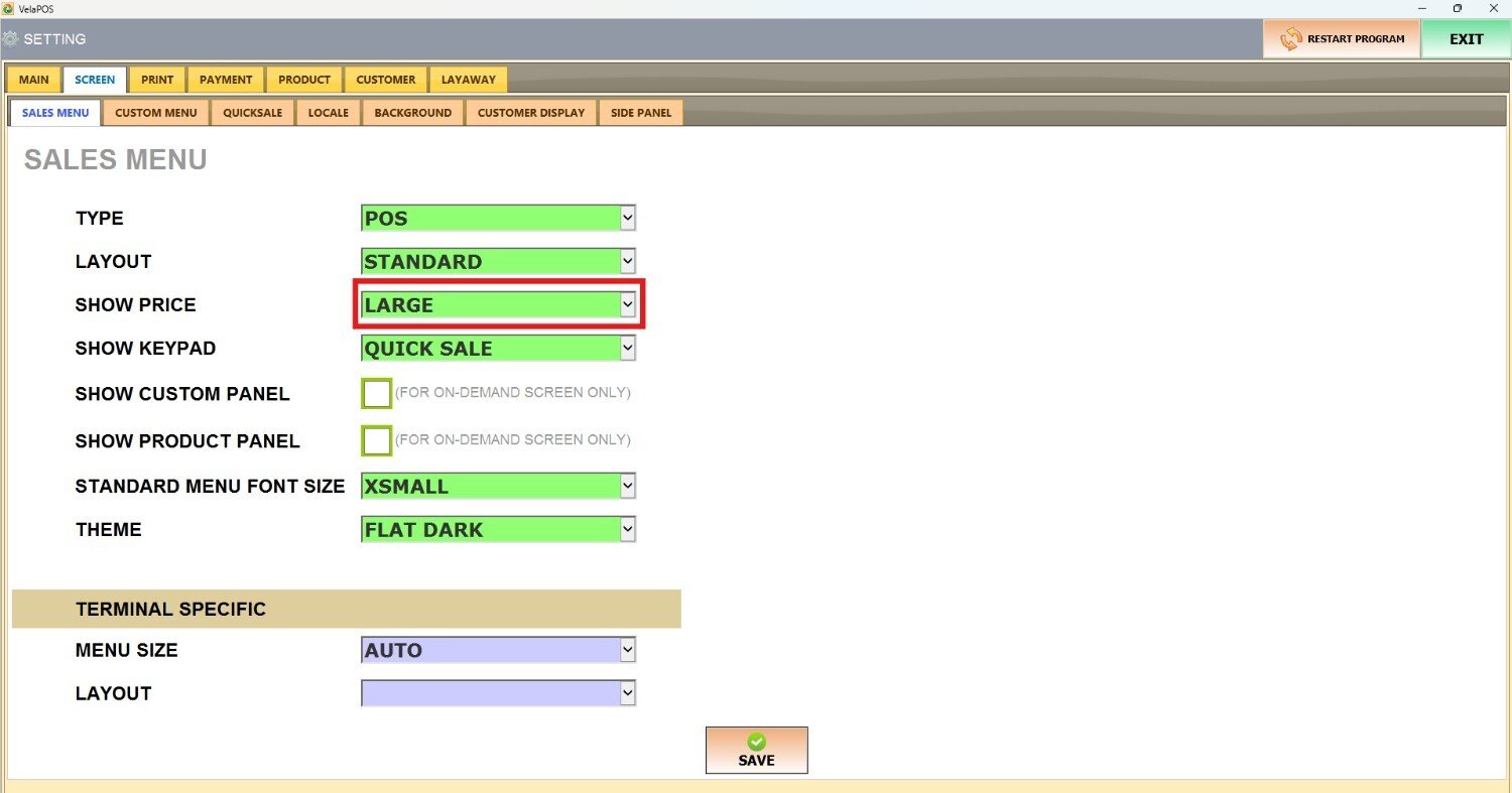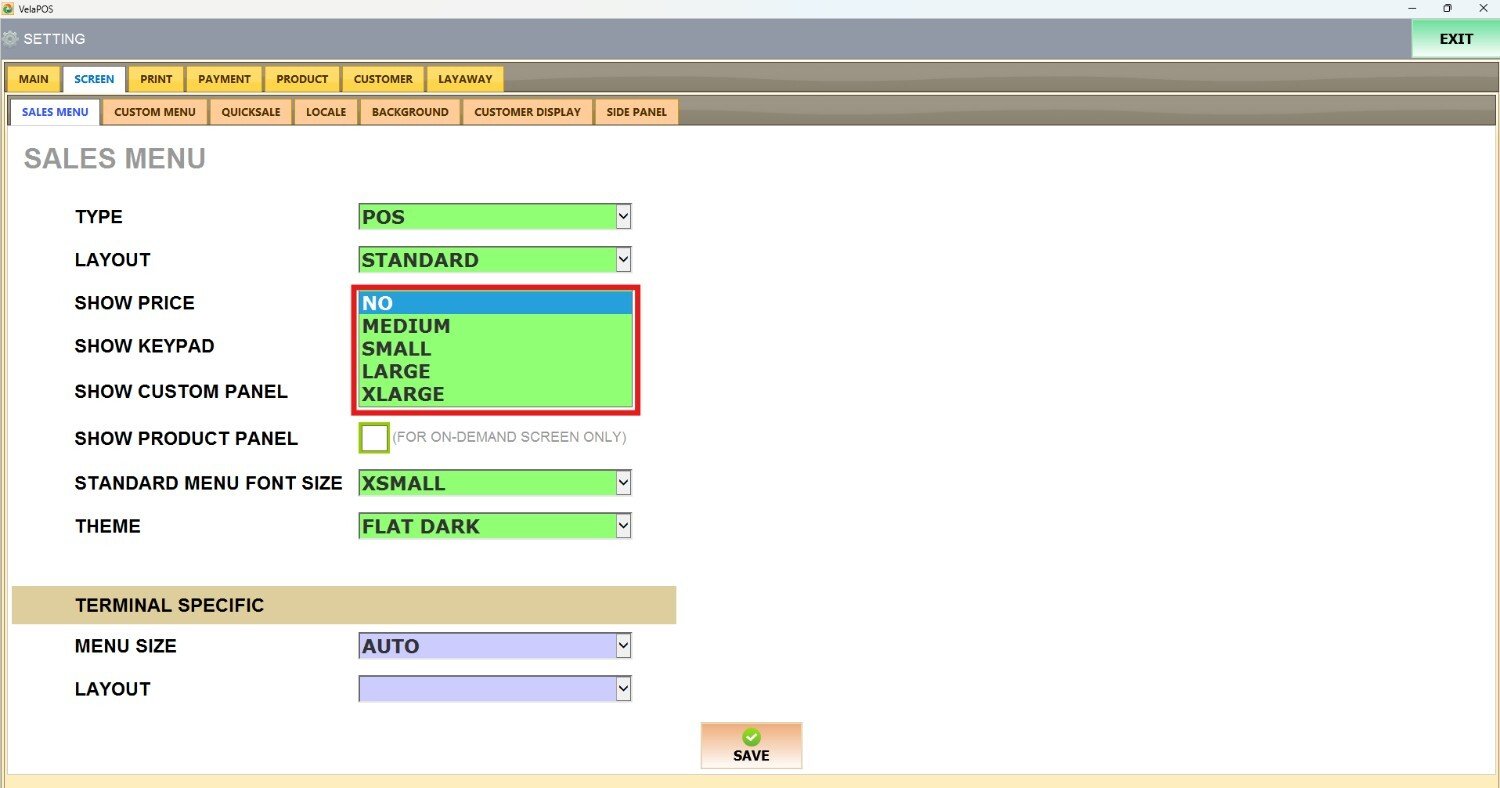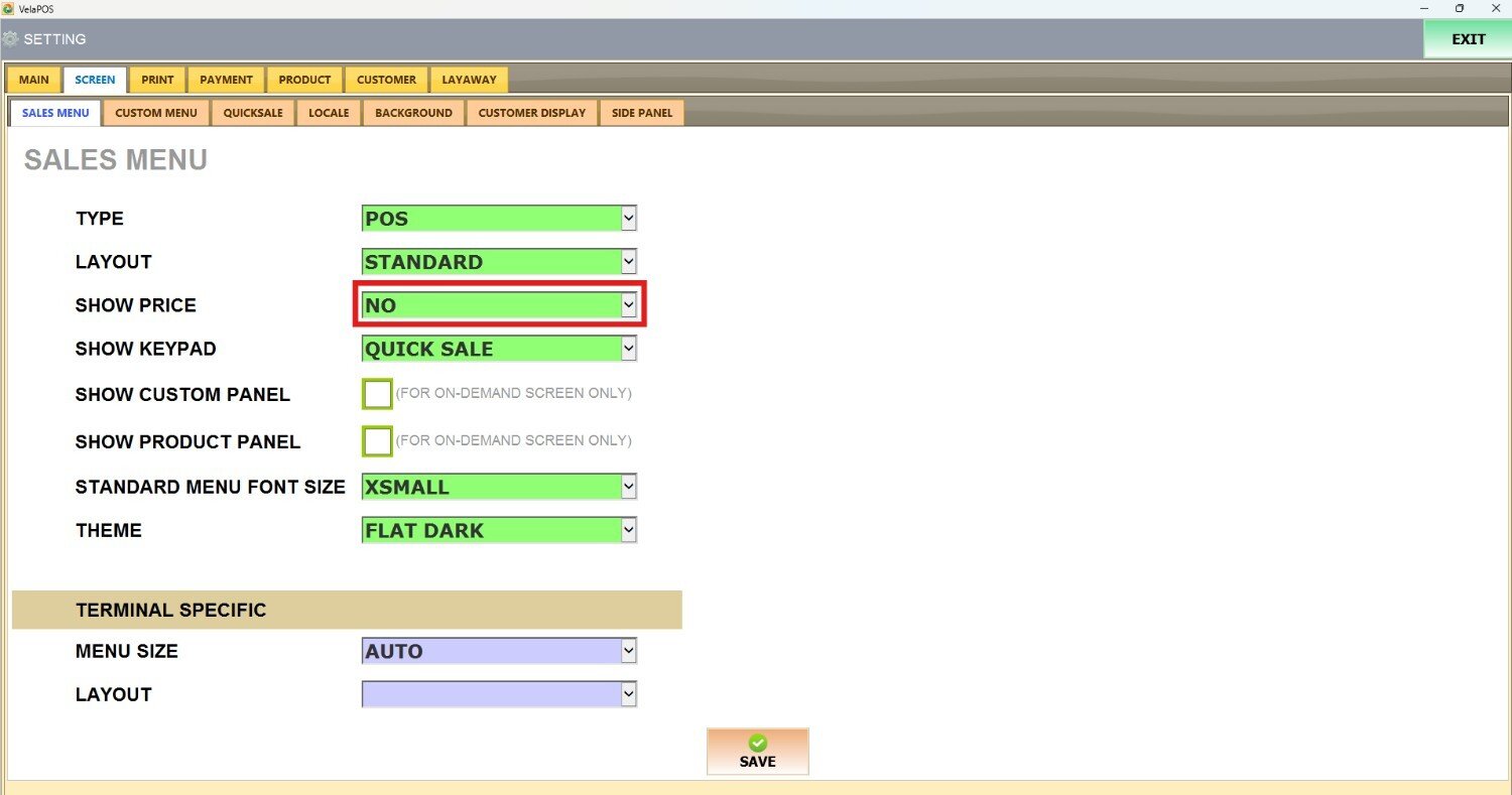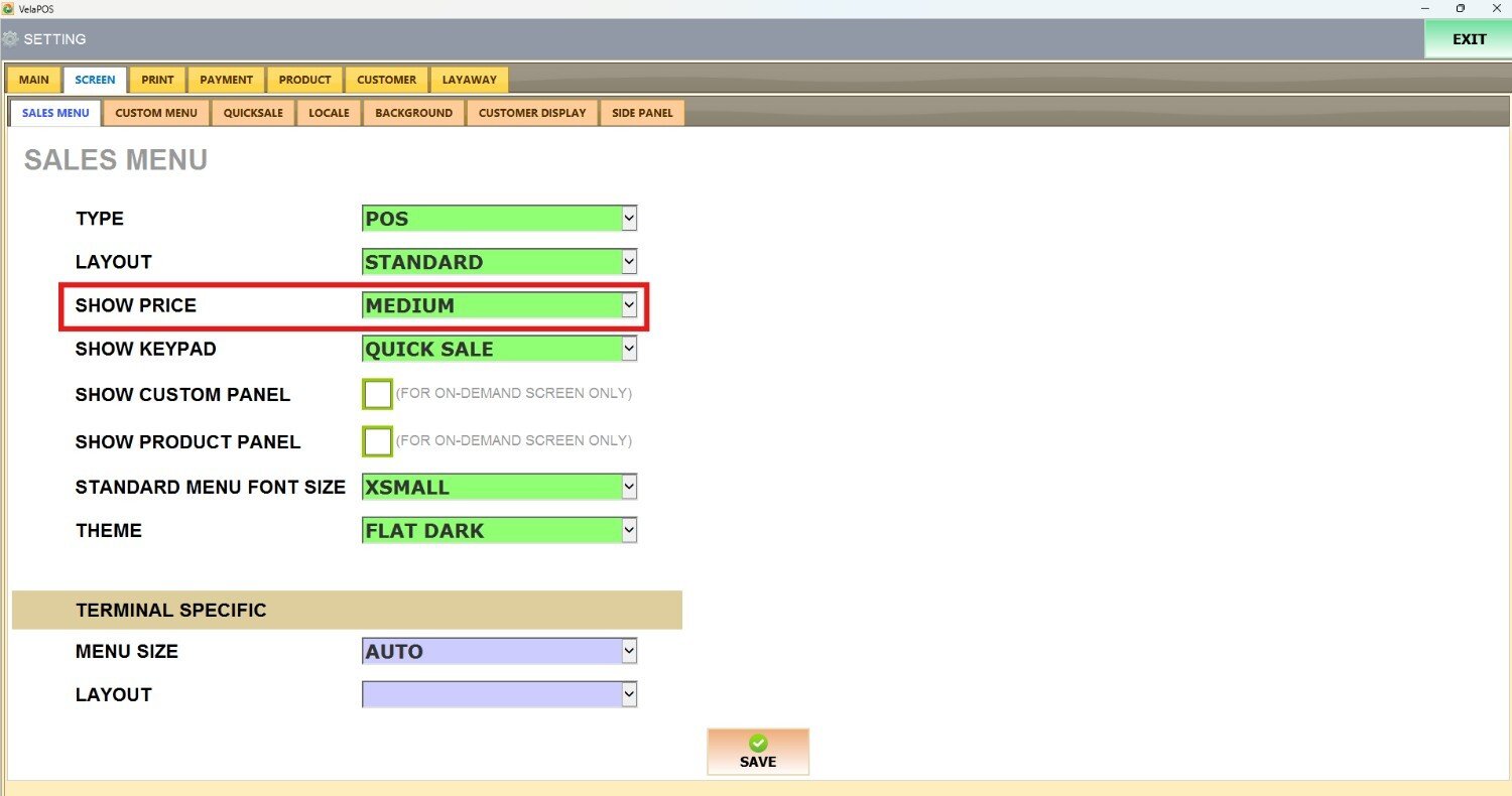 Under the SCREEN tab, select SALES MENU and navigate to the SHOW PRICE section.